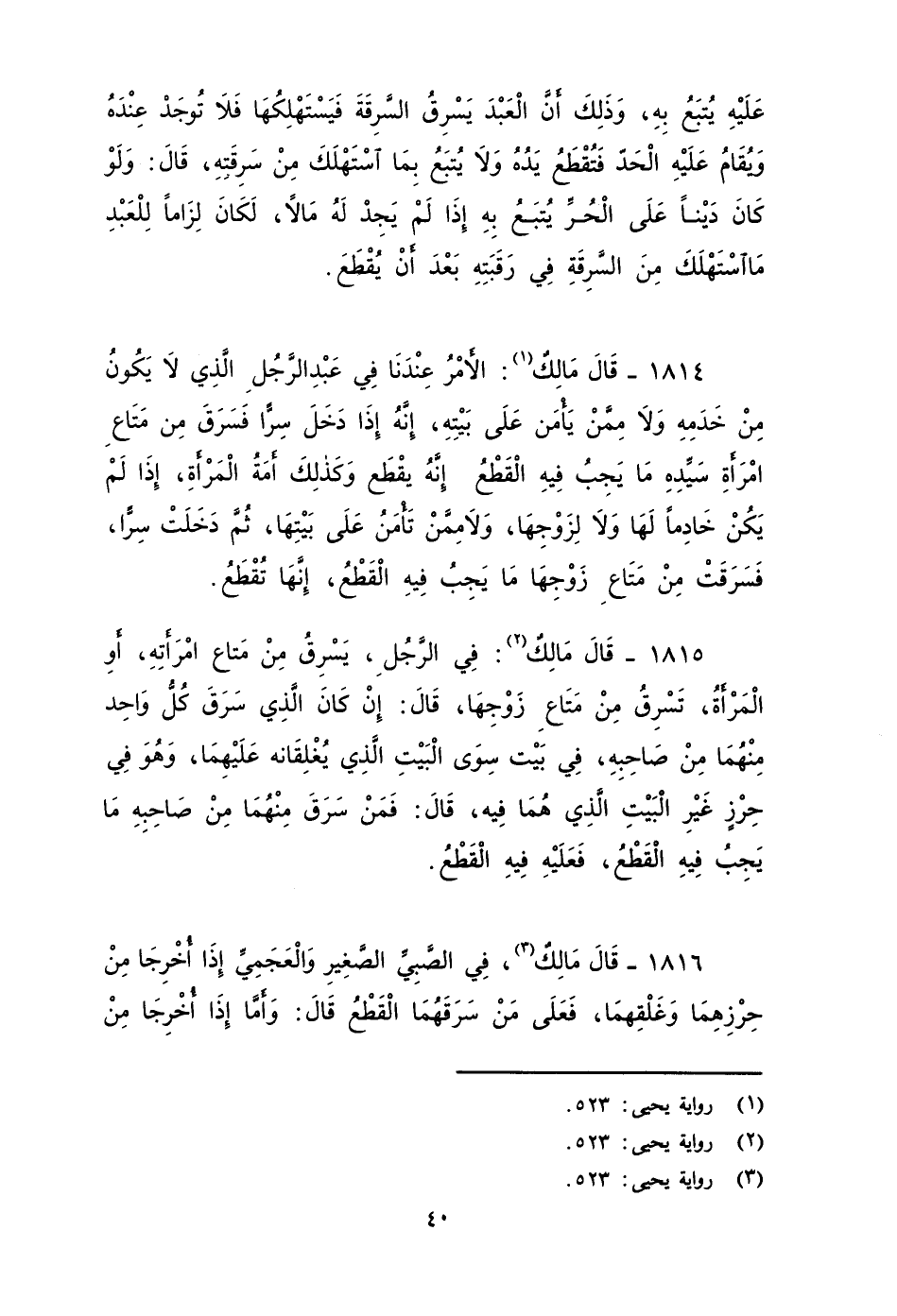 ١٨١٦ - قَالَ مَالِكٌ: فِي الصَّبِيِّ الصَّغِيرِ وَالعْجَمِيِّ إِذَا أخرجا مِنْ حِرْزِهِمَاوْ غَلْقِهِمَا، فَعَلَى مَنْ سَرَقَهُمَا الْقَطْعُ، قَالَ: وأما إِذا أخَرَجَا مِنْ غيرحِرْزِهِمَا وَغَلْقِهِمَا، فَلَيْسَ عَلَى مَنْ سَرَقَهُمَا قَطْعٌ، وَإِنَّمَا هُمَا بِمَنْزِلَةِ حَرِيسَةِ الْجَبَلِ وَالثَّمَرِ الْمُعَلَّقِ.