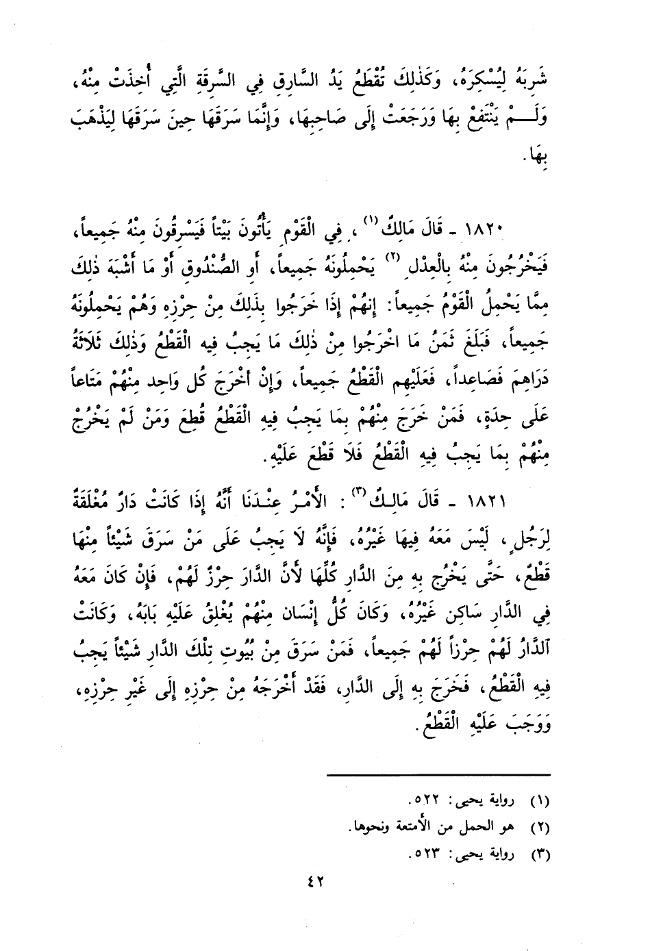 ١٨٢١ - قَالَ مَالِكٌ: الأََمْرُ عِنْدَنَا أَنَّهُ إِذَا كَانَتْ دَارُ مُغْلَقَةً لرَجُلٍ , لَيْسَ مَعَهُ فِيهَا غَيْرُهُ , فَإِنَّهُ لَا يَجِبُ عَلَى مَنْ سَرَقَ شَيْئًا مِنْهَا قَطْعُ , حَتَّى يَخْرُجَ بِهِ مِنَ الدَّارِ كُلِّهَا لأن الدَّارَ حِرْزُلهم , فَإِنْ كَانَ مَعَهُ فِي الدَّارِ سَاكِنٌ غَيْرُهُ وَكَانَ كُلُّ إِنْسَانٍ مِنْهُمْ يُغْلِقُ عَلَيْهِ بَابَهُ وَكَانَتْ الدَّارَلهم حِرْزًا لَهُمْ جَمِيعًا , فَمَنْ سَرَقَ مِنْ بُيُوتِ تِلْكَ الدَّارِ شَيْئًا يَجِبُ فِيهِ الْقَطْعُ , فَخَرَجَ بِهِ إِلَى الدَّارِ , فَقَدْ أَخْرَجَهُ مِنْ حِرْزِهِ إِلَى غَيْرِ حِرْزِهِ , وَوَجَبَ عَلَيْهِ الْقَطْعُ.