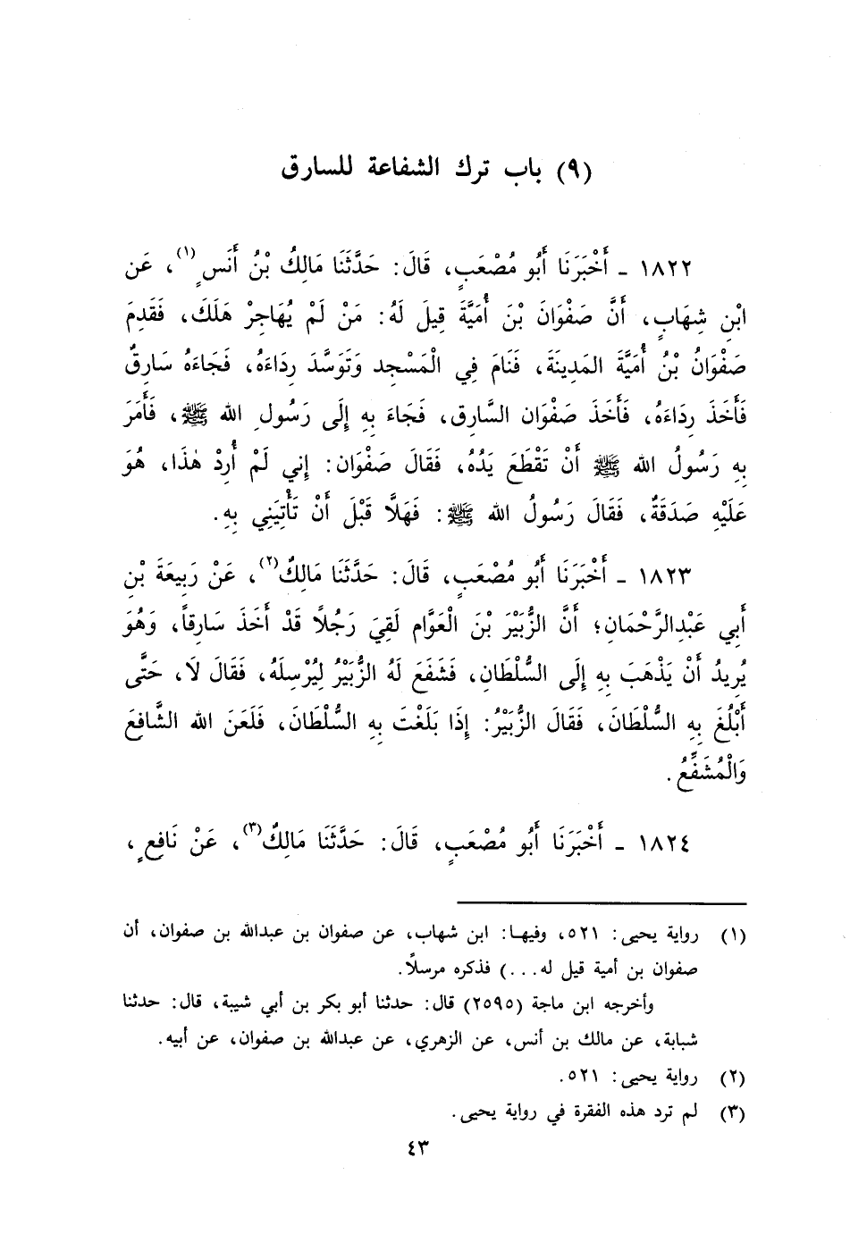 ١٨٢٣ - أَخْبَرَنَا أَبُو مُصْعَبٍ، قَالَ: حَدَّثَنَا مَالِكٌ، عَنْ رَبِيعَةَ بْنِ أَبِي عَبْدِ الرَّحْمَنِ، أَنَّ الزُّبَيْرَ بْنَ الْعَوَّامِ، لَقِيَ رَجُلاً قَدْ أَخَذَ سَارِقًا، وَهُوَ يُرِيدُ أَنْ يَذْهَبَ بِهِ إِلَى السُّلْطَانِ، فَشَفَعَ لَهُ الزُّبَيْرُ لِيُرْسِلَهُ، فَقَالَ: لَا , حَتَّى أَبْلُغَ بِهِ السُّلْطَانَ، فَقَالَ الزُّبَيْرُ: إِذَا بَلَغْتَ بِهِ السُّلْطَانَ , فَلَعَنَ اللَّهُ الشَّافِعَ وَالْمُشَفِّعَ.
