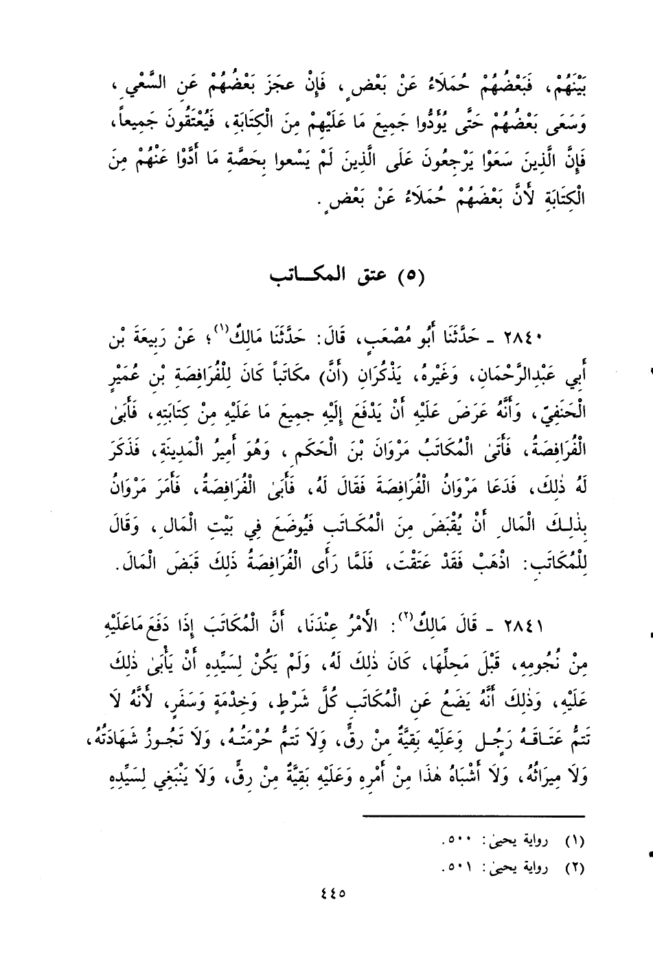 ٢٨٤٠ - حدثنَا أَبُو مُصْعَبٍ، قَالَ: حَدَّثَنَا مَالِكٌ، عن رَبِيعَةَ بْنَ أَبِي عَبْدِ الرَّحْمَنِ، وَغَيْرَهُ يَذْكُرُانَ , أَنَّ مُكَاتَبًا كَانَ لِلْفُرَافِصَةِ بْنِ عُمَيْرٍ الْحَنَفِيِّ , وَأَنَّهُ عَرَضَ عَلَيْهِ أَنْ يَدْفَعَ إِلَيْهِ جَمِيعَ مَا عَلَيْهِ مِنْ كِتَابَتِهِ، فَأَبَى الْفُرَافِصَةُ , فَأَتَى الْمُكَاتَبُ مَرْوَانَ بْنَ الْحَكَمِ , وَهُوَ أَمِيرُ الْمَدِينَةِ , فَذَكَرَ لَهُ ذَلِكَ , فَدَعَا مَرْوَانُ الْفُرَافِصَةَ , فَقَالَ لَهُ، فَأَبَى الْفُرَافِصَةَ , فَأَمَرَ مَرْوَانُ بِذَلِكَ الْمَالِ أَنْ يُقْبَضَ مِنَ الْمُكَاتَبِ , فَيُوضَعَ فِي بَيْتِ الْمَالِ، وَقَالَ لِلْمُكَاتَبِ: اذْهَبْ فَقَدْ عَتَقْتَ، فَلَمَّا رَأَى الْفُرَافِصَةُ ذَلِكَ قَبَضَ الْمَالَ.