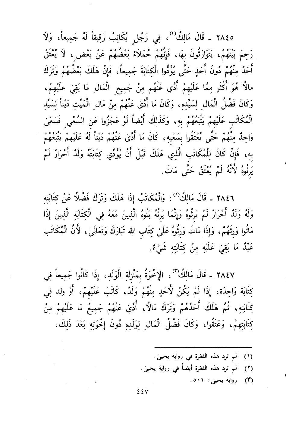 ٢٨٤٦ - قَالَ مَالِكٌ: وَالْمُكَاتَبُ إِذَا هَلَكَ وَتَرَكَ فَضَلاً عَنْ كِتَابَتِهِ وَلَهُ وَلَدٌ أَحْرَارٌ لَمْ يَرِثُوهُ، وَإِنَّمَا يَرِثُهُ بَنُوهُ الَّذِينَ مَعَهُ فِي الْكِتَابَةِ الَّذِينَ إِذَا مَاتُوا وَرِثَهُمْ، وَإِذَا مَاتَ وَرِثُوهُ عَلَى كِتَابِ اللهِ تَبَارَكَ وَتَعَالَى، لأَنَّ الْمُكَاتَبُ عَبْدٌ مَا بَقِيَ عَلَيْهِ مِنْ كِتَابَتِهِ شَيْءٌ.