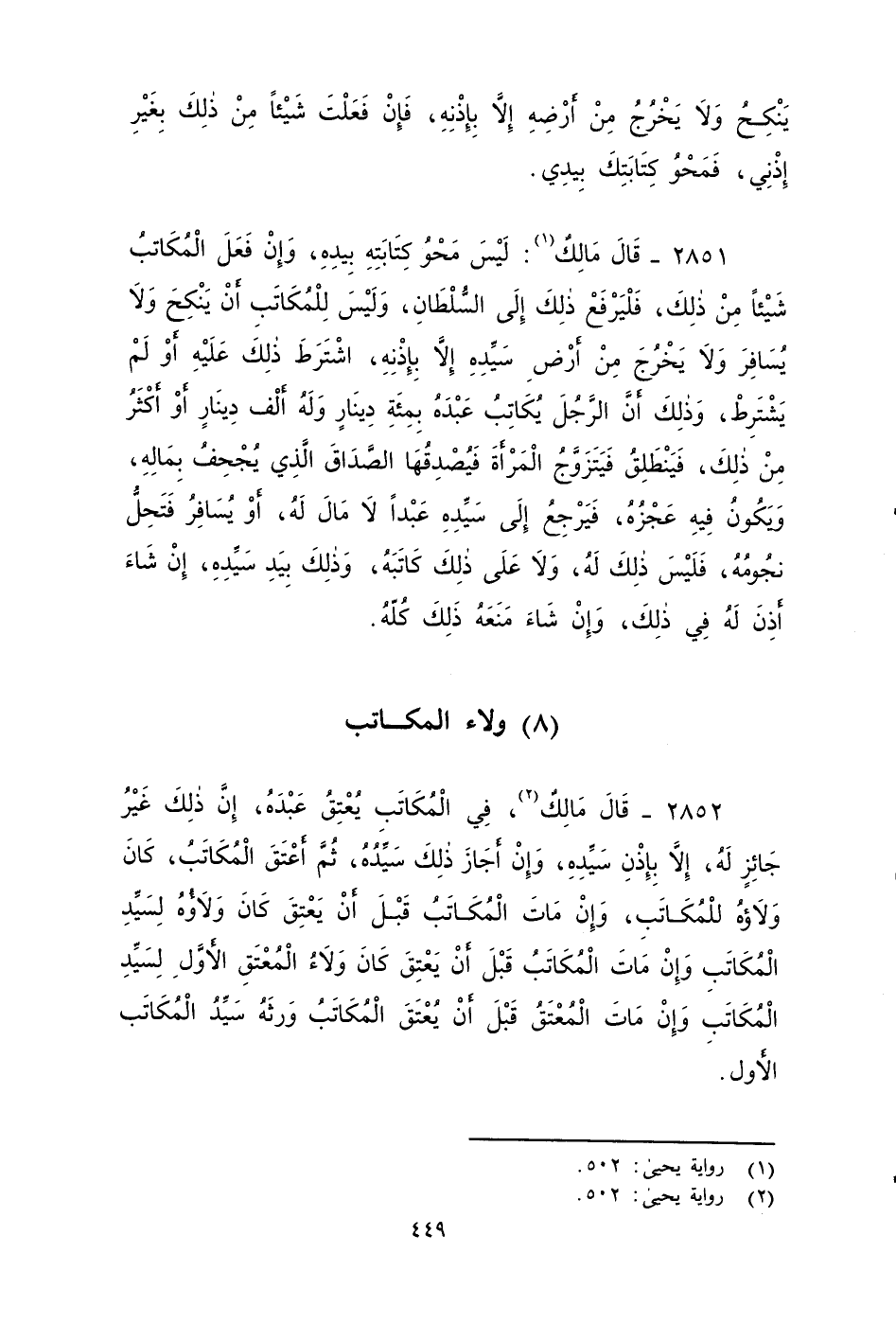 ٢٨٥١ - قَالَ مَالِكٌ: لَيْسَ مَحْوُ كِتَابَتِهِ بِيَدِهِ وإِنْ فَعَلَ الْمُكَاتَبُ شَيْئًا مِنْ ذَلِكَ، فلْيَرْفَعْ ذَلِكَ إِلَى السُّلْطَانِ , وَلَيْسَ لِلْمُكَاتَبِ أَنْ يَنْكِحَ وَلَا يُسَافِرَ وَلَا يَخْرُجَ مِنْ أَرْضِ سَيِّدِهِ، إِلَاّ بِإِذْنِهِ , اشْتَرَطَ ذَلِكَ أَوْ لَمْ يَشْتَرِطْ , وَذَلِكَ أَنَّ الرَّجُلَ يُكَاتِبُ عَبْدَهُ بِمِائَةِ دِينَارٍ , وَلَهُ أَلْفُ دِينَارٍ أَوْ أَكْثَرُ مِنْ ذَلِكَ , فَيَنْطَلِقُ فَيَتزوج الْمَرْأَةَ , فَيُصْدِقُهَا الصَّدَاقَ الَّذِي يُجْحِفُ بِمَالِهِ , وَيَكُونُ فِيهِ عَجْزُهُ , فَيَرْجِعُ إِلَى سَيِّدِهِ عَبْدًا لَا مَالَ لَهُ، أَوْ يُسَافِرُ فَتَحِلُّ نُجُومُهُ , فَلَيْسَ ذَلِكَ لَهُ , وَلَا عَلَى ذَلِكَ كَاتَبَهُ، وَذَلِكَ بِيَدِ سَيِّدِهِ , إِنْ شَاءَ أَذِنَ لَهُ فِي ذَلِكَ , وَإِنْ شَاءَ مَنَعَهُ ذلك كله.