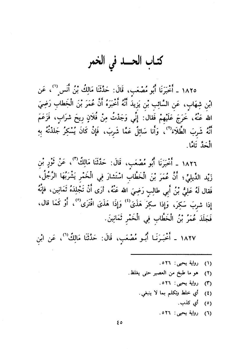 ١٨٢٦ - أَخْبَرَنَا أَبُو مُصْعَبٍ، قَالَ: حَدَّثَنَا مَالِكٌ، عَنْ ثَوْرِ بْنِ زَيْدٍ الدِّيلِيِّ، أَنَّ عُمَرَ بْنَ الْخَطَّابِ اسْتَشَارَ فِي الْخَمْرِ يَشْرَبُهَا الرَّجُلُ , فَقَالَ لَهُ عَلِيُّ بْنُ أَبِي طَالِبٍ - رضي الله عنه -: أرَى أَنْ تَجْلِدَهُ ثَمَانِينَ، فَإِنَّهُ إِذَا شَرِبَ سَكِرَ، وَإِذَا سَكِرَ هَذَى، وَإِذَا هَذَى افْتَرَى، أَوْ كَمَا قَالَ , فَجَلَدَ عُمَرُبْنَ الْخَطَّابِ فِي الْخَمْرِ ثَمَانِينَ.
