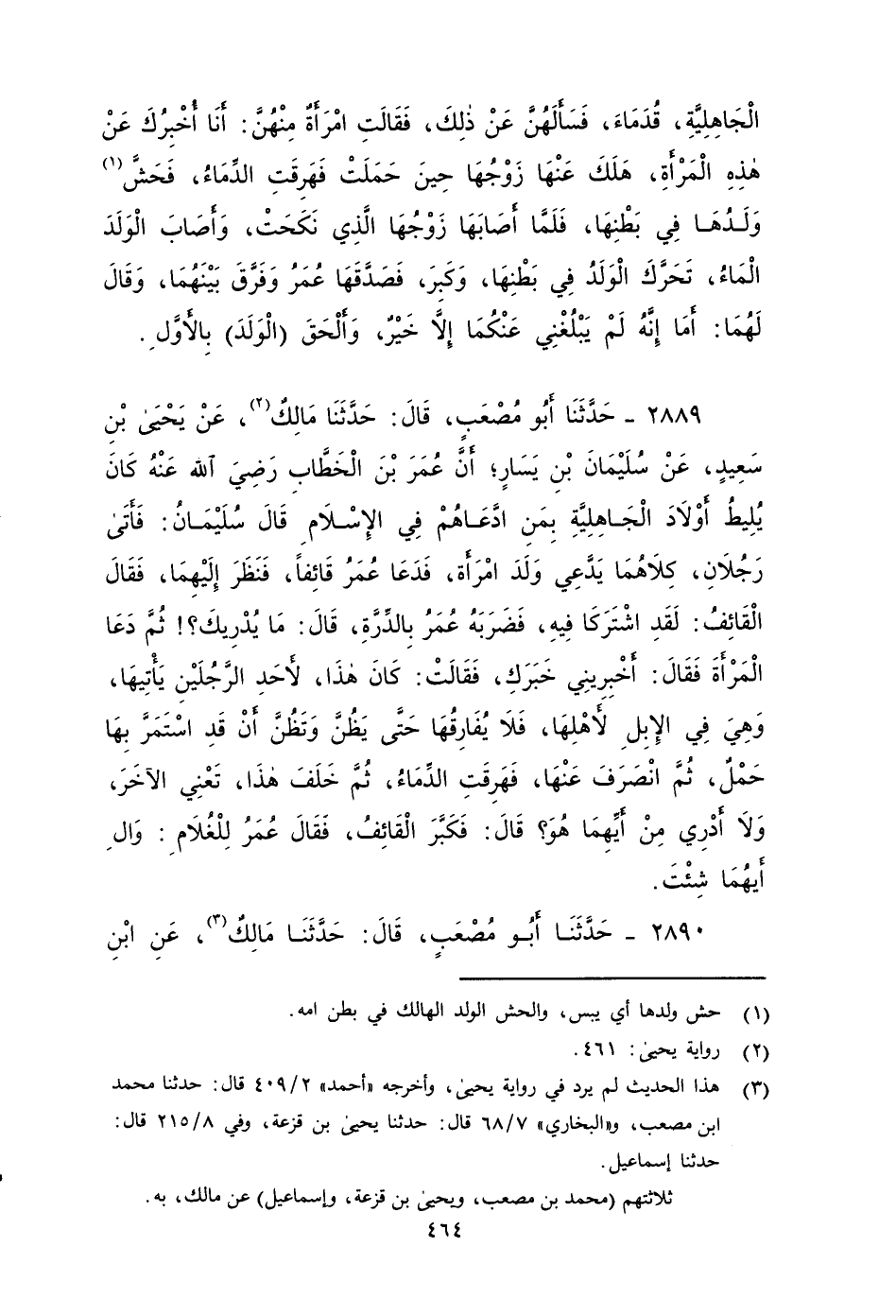 ٢٨٨٩ - حدثنَا أَبُو مُصْعَبٍ، قَالَ: حَدَّثَنَا مَالِكٌ، عَنْ يَحْيَى بْنِ سَعِيدٍ، عَنْ سُلَيْمَانَ بْنِ يَسَارٍ، أَنَّ عُمَرَ بْنَ الْخَطَّابِ - رضي الله عنه - كَانَ يُلِيطُ أَوْلَادَ الْجَاهِلِيَّةِ بِمَنِ ادَّعَاهُمْ فِي الإِسْلَامِ، قال سليمان فَأَتَى رَجُلَانِ كِلَاهُمَا يَدَّعِي وَلَدَ امْرَأَةٍ، فَدَعَا عُمَرُ قَائِفًا , فَنَظَرَ إِلَيْهِمَا، فَقَالَ الْقَائِفُ: لَقَدِ اشْتَرَكَا فِيهِ , فَضَرَبَهُ عُمَرُ بِالدِّرَّةِ، قال: ما يدريك؟ ثُمَّ دَعَا الْمَرْأَةَ، فَقَالَ: أَخْبِرِينِي خَبَرَكِ؟ فَقَالَتْ: كَانَ هَذَا لأَحَدِ الرَّجُلَيْنِ يَأْتِيها، وَهِيَ فِي الإِبِلٍ لأَهْلِهَا، فَلَا يُفَارِقُهَا حَتَّى يَظُنَّ وَتَظُنَّ أَنَّ قَدِ اسْتَمَرَّ بِهَا حَملٌ، ثُمَّ انْصَرَفَ عَنْهَا، فَهَرِقَتْ الدِمَاءٌ، ثُمَّ خَلَفَ هَذَا، تَعْنِي الآخَرَ، ولَا أَدْرِي مِنْ أَيِّهِمَا هُوَ؟ قَالَ: فَكَبَّرَ الْقَائِفُ , فَقَالَ عُمَرُ لِلْغُلَامِ: وَالِ أَيَّهُمَا شِئْتَ.
