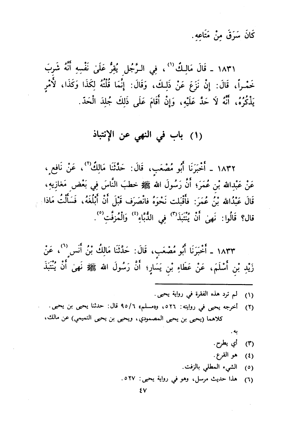 ١٨٣٢ - أَخْبَرَنَا أَبُو مُصْعَبٍ، قَالَ: حَدَّثَنَا مَالِكٌ، عَنْ نَافِعٍ، عَنِ عبد الله ابْنِ عُمَرَ، أَنَّ رَسُولَ اللَّهِ صَلى الله عَلَيه وَسَلم خَطَبَ النَّاسَ فِي بَعْضِ مَغَازِيهِ، قَالَ عَبْدُ اللَّهِ بْنُ عُمَرَ: فَأَقْبَلْتُ نَحْوَهُ، فَانْصَرَفَ قَبْلَ أَنْ أَبْلُغَهُ، فَسَأَلْتُ: مَاذَا قَالَ؟ قالوا: نَهَى أَنْ يُنْتبَذَ فِي الدُّبَّاءِ وَالْمُزَفَّتِ.