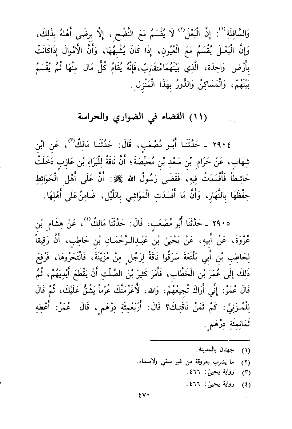 ٢٩٠٤ - حدثنَا أَبُو مُصْعَبٍ، قَالَ: حَدَّثَنَا مَالِكٌ، عَنْ ابْنِ شِهَابٍ، عَنْ حَرَامِ بْنِ سَعْدِ بْنِ مُحَيِّصَةَ، أَنَّ نَاقَةً لِلْبَرَاءِ بْنِ عَازِبٍ دَخَلَتْ حَائِطَاً، فَأَفْسَدَتْ فِيهِ، فَقَضَى رَسُولُ اللَّهِ صَلى الله عَلَيه وَسَلم أَنَّ عَلَى أَهْلِ الْحَوَائِطِ حِفْظَهَا بِالنَّهَارِ، وَأَنَّ مَا أَفْسَدَتِ الْمَوَاشِي بِاللَّيْلِ ضَامِنٌ عَلَى أَهْلِهَا.