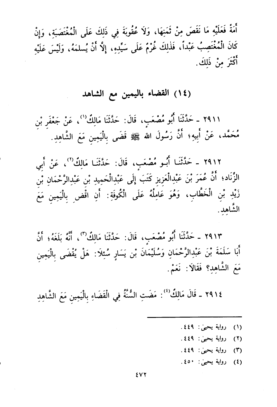 ٢٩١٣ - حدثنَا أَبُو مُصْعَبٍ، قَالَ: حَدَّثَنَا مَالِكٌ , أنَّهُ بَلَغَهُ، أَنَّ أَبَا سَلَمَةَ بْنَ عَبْدِ الرَّحْمَنِ , وَسُلَيْمَانَ بْنَ يَسَارٍ سُئِلَا: هَلْ يُقْضَى بِالْيَمِينِ مَعَ الشَّاهِدِ، فَقَالَا: نَعَمْ.