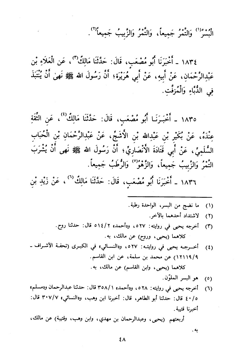 ١٨٣٥ - أَخْبَرَنَا أَبُو مُصْعَبٍ، قَالَ: حَدَّثَنَا مَالِكٌ، عَنْ الثِّقَةِ عِنْدَهُ، عَنْ بُكَيْرِ بْنِ عَبْدِ اللَّهِ بْنِ الأَشَجِّ، عَنْ عَبْدِ الرَّحْمَنِ بْنِ الْحُبَابِ السلمي، عَنْ أَبِي قَتَادَةَ الأَنْصَارِيِّ، أَنَّ رَسُولَ اللَّهِ صَلى الله عَلَيه وَسَلم نَهَى أَنْ يُشْرَبَ التَّمْرُ وَالزَّبِيبُ جَمِيعًا، وَالزَّهْوُ وَالرُّطَبُ جَمِيعًا.