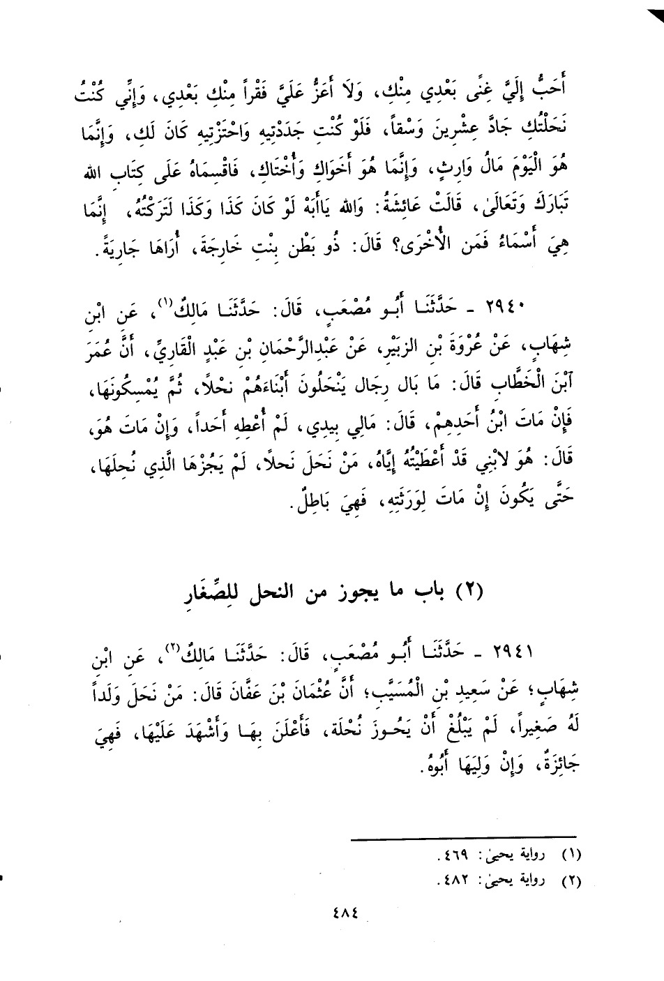 ٢٩٤٠ - حدثنَا أَبُو مُصْعَبٍ، قَالَ: حَدَّثَنَا مَالِكٌ، عنِ ابْنِ شِهَابٍ، عَنْ عُرْوَةَ بْنِ الزُّبَيْرِ، عَنْ عَبْدِ الرَّحْمَنِ بْنِ عَبْدٍ الْقَارِيِّ، أَنَّ عُمَرَ بْنَ الْخَطَّابِ قَالَ: مَا بَالُ رِجَالٍ يَنْحَلُونَ أَبْنَاءَهُمْ نُحْلاً، ثُمَّ يُمْسِكُونَهَا , فَإِنْ مَاتَ ابْنُ أَحَدِهِمْ، قَالَ: مَا لِي بِيَدِي لَمْ أُعْطِهِ أَحَدًا، وَإِنْ مَاتَ هُوَ، قَالَ: هُوَ لاِبْنِي قَدْ أَعْطَيْتُهُ إِيَّاهُ، مَنْ نَحَلَ نِحْلَةً، فَلَمْ يَحُزْهَا الَّذِي نُحِلَهَا، حَتَّى يكُونَ إِنْ مَاتَ لِوَرَثَتِهِ، فَهِيَ بَاطِلٌ.