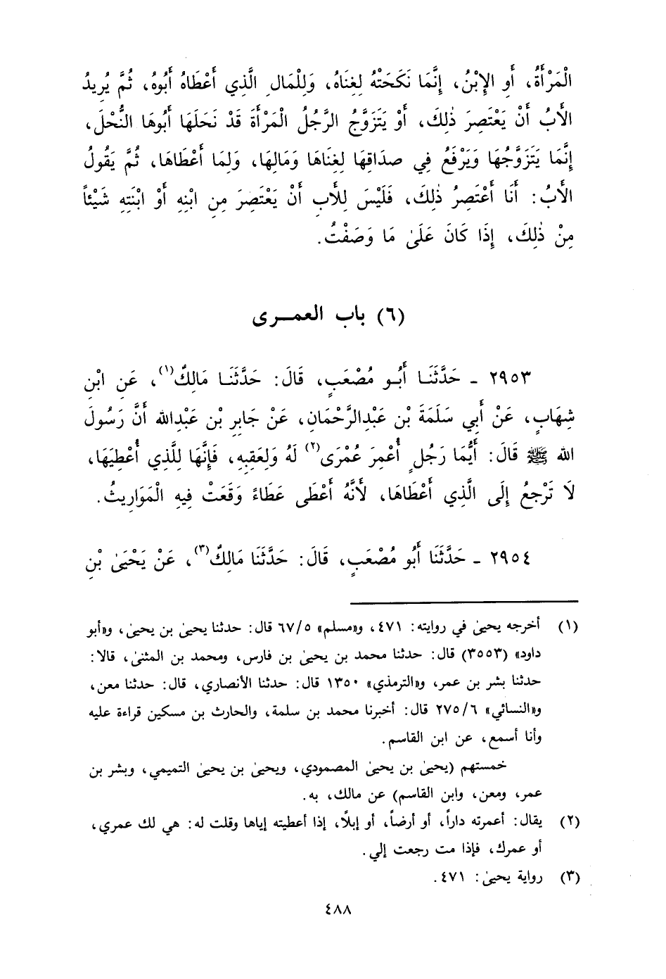 ٢٩٥٣ - حدثنَا أَبُو مُصْعَبٍ، قَالَ: حَدَّثَنَا مَالِكٌ، عَنْ ابْنِ شِهَابٍ، عَنْ أَبِي سَلَمَةَ بْنِ عَبْدِ الرَّحْمَنِ، عَنْ جَابِرِ بْنِ عَبْدِ اللَّهِ، أَنَّ رَسُولَ اللَّهِ صَلى الله عَلَيه وَسَلم، قَالَ: أَيُّمَا رَجُلٍ أُعْمِرَ عُمْرَى لَهُ وَلِعَقِبِهِ، فَإِنَّهَا لِلَّذِي أُعْطِيَهَا، لا تَرْجِعُ إِلَى الَّذِي أَعْطَاهَا، لِأَنَّهُ أَعْطَى عَطَاءً وَقَعَتْ فِيهِ الْمَوَارِيثُ.
