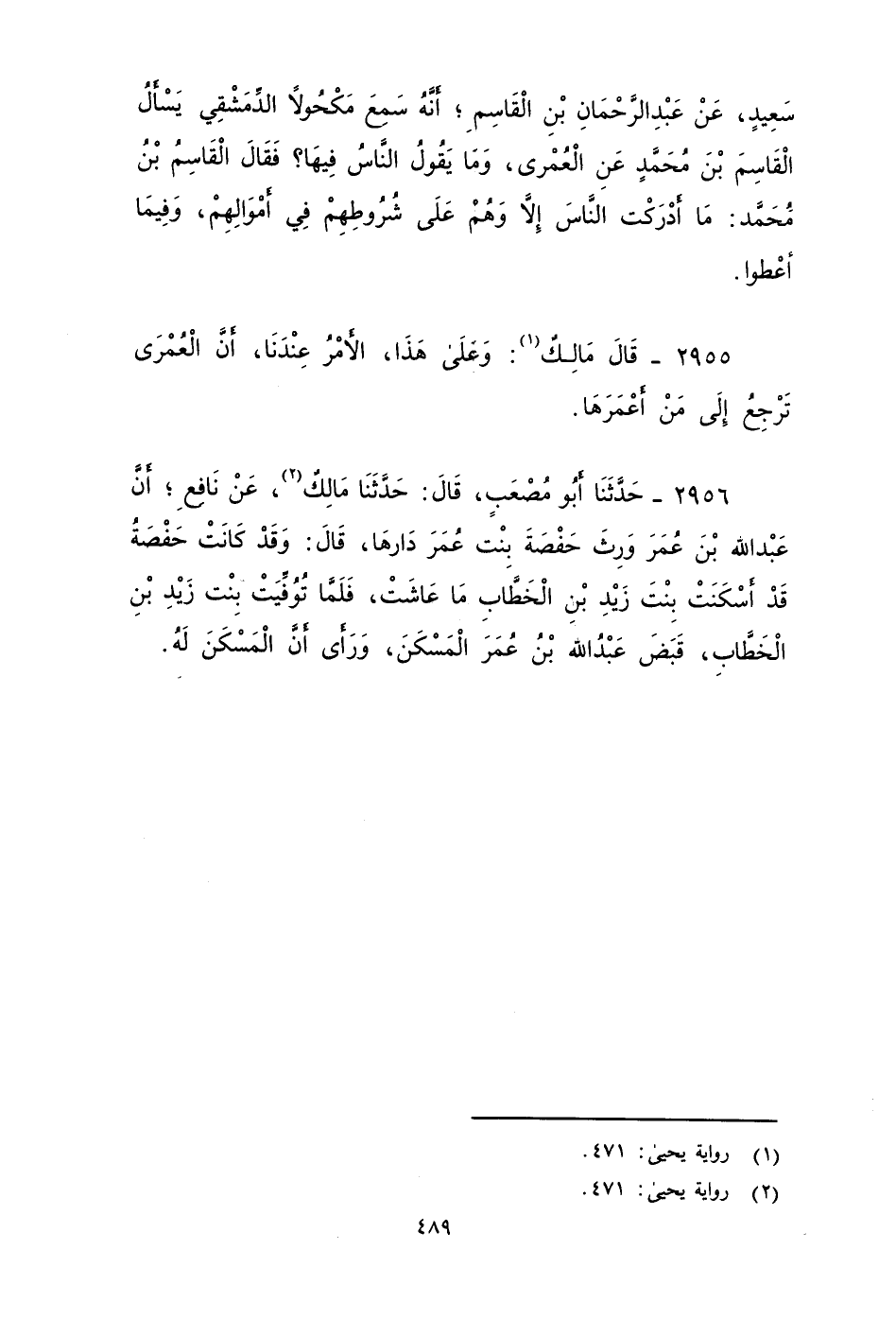 ٢٩٥٤ - حدثنَا أَبُو مُصْعَبٍ، قَالَ: حَدَّثَنَا مَالِكٌ، عَنْ يَحْيَى بْنِ سَعِيدٍ، عَنْ عَبْدِ الرَّحْمَنِ بْنِ الْقَاسِمِ , أَنَّهُ سَمِعَ مَكْحُولاً الدِّمَشْقِيَّ يَسْأَلُ الْقَاسِمَ بْنَ مُحَمَّدٍ عَنِ الْعُمْرَى وَمَا يَقُولُ النَّاسُ فِيهَا؟ فَقَالَ الْقَاسِمُ بْنُ مُحَمَّدٍ: مَا أَدْرَكْتُ النَّاسَ إِلَاّ وَهُمْ عَلَى شُرُوطِهِمْ فِي أَمْوَالِهِمْ، وَفِيمَا أُعْطُوا.
