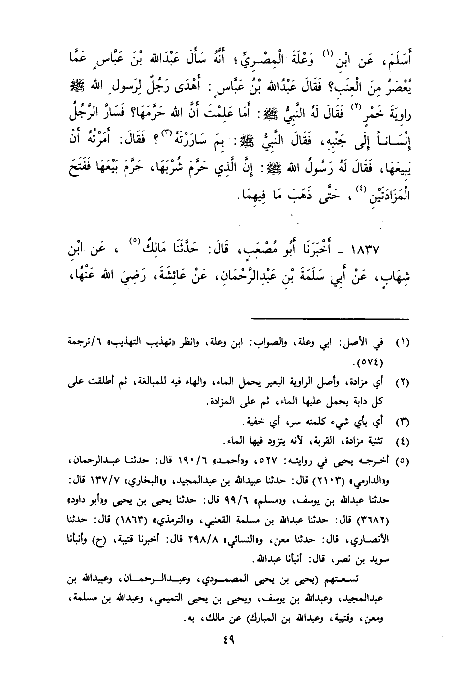 ١٨٣٦ - أَخْبَرَنَا أَبُو مُصْعَبٍ، قَالَ: حَدَّثَنَا مَالِكٌ، عَنْ زَيْدِ بْنِ أَسْلَمَ، عَنْ ابْنِ وَعْلَةَ الْمِصْرِيِّ، أَنَّهُ سَأَلَ عَبْدَ اللَّهِ بْنَ عَبَّاسٍ عَمَّا يُعْصَرُ مِنَ الْعِنَبِ؟ فَقَالَ عَبْدَ اللَّهِ ابْنُ عَبَّاسٍ: أَهْدَى رَجُلٌ لِرَسُولِ اللَّهِ صَلى الله عَلَيه وَسَلم رَاوِيَةَ خَمْرٍ، فَقَالَ لَهُ النبي صَلى الله عَلَيه وَسَلم: أَمَا عَلِمْتَ أَنَّ اللَّهَ حَرَّمَهَا؟ فَسَارَّ الرَجُلٌ إنسانا إِلَى جَنْبِهِ، فَقَالَ النبي صَلى الله عَلَيه وَسَلم: بِمَ سَارَرْتَهُ؟ فَقَالَ: أَمَرْتُهُ أَنْ يَبِيعَهَا، فَقَالَ لَهُ رَسُولُ اللَّهِ صَلى الله عَلَيه وَسَلم: إِنَّ الَّذِي حَرَّمَ شُرْبَهَا حَرَّمَ بَيْعَهَا، فَفَتَحَ الْمَزَادَتَيْنِ حَتَّى ذَهَبَ مَا فِيهِمَا.