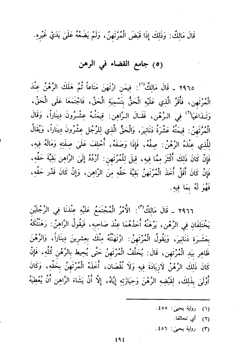 ٢٩٦٦ - قال مالك: الأََمْرُ المجتمع عليه عِنْدَنَا فِي الرَّجُلَيْنِ يَخْتَلِفَانِ فِي الرَّهْنِ، يَرْهَنُهُ أَحَدُهُمَا عند صَاحِبَهُ، فَيَقُولُ الرَّاهِنُ: رَهَنْتُكَهُ بِعَشَرَةِ دَنَانِيرَ، وَيَقُولُ الْمُرْتَهِنُ: ارْتَهَنْتُهُ مِنْكَ بِعِشْرِينَ دِينَارًا، وَالرَّهْنُ ظَاهِرٌ بِيَدِ الْمُرْتَهِنِ، قَالَ: يُحَلَّفُ الْمُرْتَهِنُ حَتَّى يُحِيطَ بالرَّهْنِ كله، فَإِنْ كَانَ ذَلِكَ الرهن، لَا زِيَادَةَ فِيهِ وَلَا نُقْصَانَ، أَخَذَهُ الْمُرْتَهِنُ بِحَقِّهِ، وَكَانَ أَوْلَى بِذلك لِقَبْضِهِ الرَّهْنَ وَحِيَازَتِهِ إِيَّاهُ، إِلَاّ أَنْ يَشَاءَ الراَّهْنِ أَنْ يُعْطِيَهُ الَّذِي حُلِّفَ عَلَيْهِ، وَيَأْخُذَ رَهْنَهُ فإِنْ كَانَ الحق أكثر من قيمة الرَّهْنُ أُحْلِفَ الْمُرْتَهِنُ عَلَى الْعِشْرِينَ الَّتِي سَمَّى، ثُمَّ يُقَالُ لِلرَّاهِنِ: إِمَّا أَنْ تُعْطِيَهُ الَّذِي حَلَفَ عَلَيْهِ، وَإِمَّا أَنْ تَحْلِفَ بالله عَلَى الَّذِي قُلْتَ، وَيَبْطُلُ عَنْكَ مَا زَادَ عَلَى الرَّهْنِ، فَإِنْ حَلَفَ بَطَلَ عَنْهُ مازاد على الرهن، مَما حَلَفَ عَلَيْهِ صَاحِبُهُ فَإِنْ لَمْ يَحْلِفْ لَزِمَهُ ما حلف عليه صاحبه.