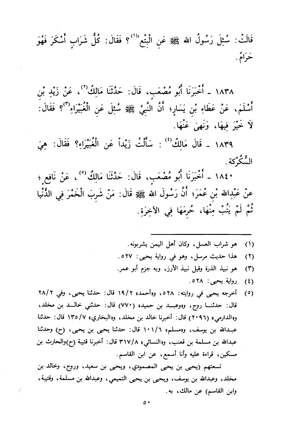 ١٨٤٠ - أَخْبَرَنَا أَبُو مُصْعَبٍ، قَالَ: حَدَّثَنَا مَالِكٌ، عَنْ نَافِعٍ، عَنِ عبد الله ابْنِ عُمَرَ، أَنَّ رَسُولَ اللَّهِ صَلى الله عَلَيه وَسَلم، قَالَ: مَنْ شَرِبَ الْخَمْرَ فِي الدُّنْيَا ثُمَّ لَمْ يَتُبْ مِنْهَا حُرِمَهَا فِي الْآخِرَةِ.