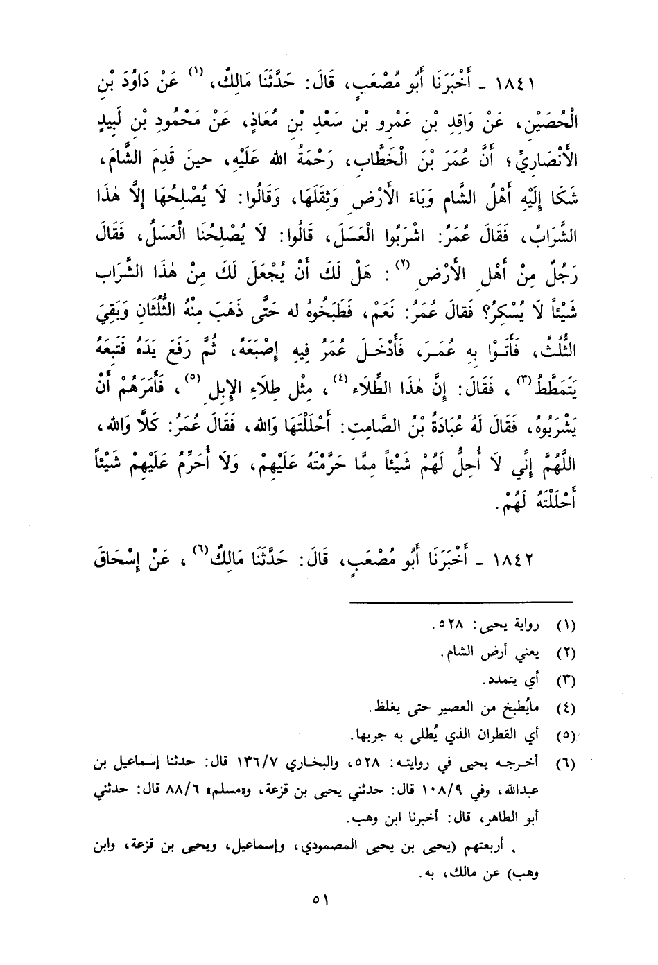 ١٨٤١ - أَخْبَرَنَا أَبُو مُصْعَبٍ، قَالَ: حَدَّثَنَا مَالِكٌ، عَنْ دَاوُدَ بْنِ الْحُصَيْنِ، عَنْ وَاقِدِ بْنِ عَمْرِو بْنِ سَعْدِ بْنِ مُعَاذٍ، أَنَّهُ أَخْبَرَهُ عَنْ مَحْمُودِ بْنِ لَبِيدٍ الأََنْصَارِيِّ، أَنَّ عُمَرَ بْنَ الْخَطَّابِ - رحمة الله عليه - حِينَ قَدِمَ الشَّامَ , شَكَا إِلَيْهِ أَهْلُ الشَّامِ وَبَاءَ الأََرْضِ وَثِقَلَهَا، وَقَالُوا: لَا يُصْلِحُها إِلَاّ هَذَا الشَّرَابُ، فَقَالَ عُمَرُ: اشْرَبُوا الْعَسَلَ، فَقَالُوا: لَا يُصْلِحُنَا الْعَسَلُ، فَقَالَ رَجُلٌ مِنْ أَهْلِ الأََرْضِ: هَلْ لَكَ أَنْ يجْعَلَ لَكَ مِنْ هَذَا الشَّرَابِ شَيْئًا لَا يُسْكِرُ؟ قَالَ: نَعَمْ، فَطَبَخُوهُ له حَتَّى ذَهَبَ مِنْهُ الثُّلُثَانِ , وَبَقِيَ الثُّلُثُ، فَأَتَوْا بِهِ عُمَرَ , فَأَدْخَلَ عُمَرُفِيهُ إِصْبَعَهِ , ثُمَّ رَفَعَ يَدَهُ، فَتَبِعَهَ يَتَمَطَّطُ , فَقَالَ: هَذَا الطِّلَاءُ , هَذَا مِثْلُ طِلَاءِ الإِبِلِ , فَأَمَرَهُمْ عُمَرُ أَنْ يَشْرَبُوهُ، فَقَالَ لَهُ عُبَادَةُ بْنُ الصَّامِتِ: أَحْلَلْتَهَا وَاللَّهِ , فَقَالَ عُمَرُ: كَلَاّ وَاللَّهِ , اللَّهُمَّ إِنِّي لَا أُحِلُّ لَهُمْ شَيْئًا مما حَرَّمْتَهُ عَلَيْهِمْ، وَلَا أُحَرِّمُ عَلَيْهِمْ شَيْئًا أَحْلَلْتَهُ لَهُمْ.