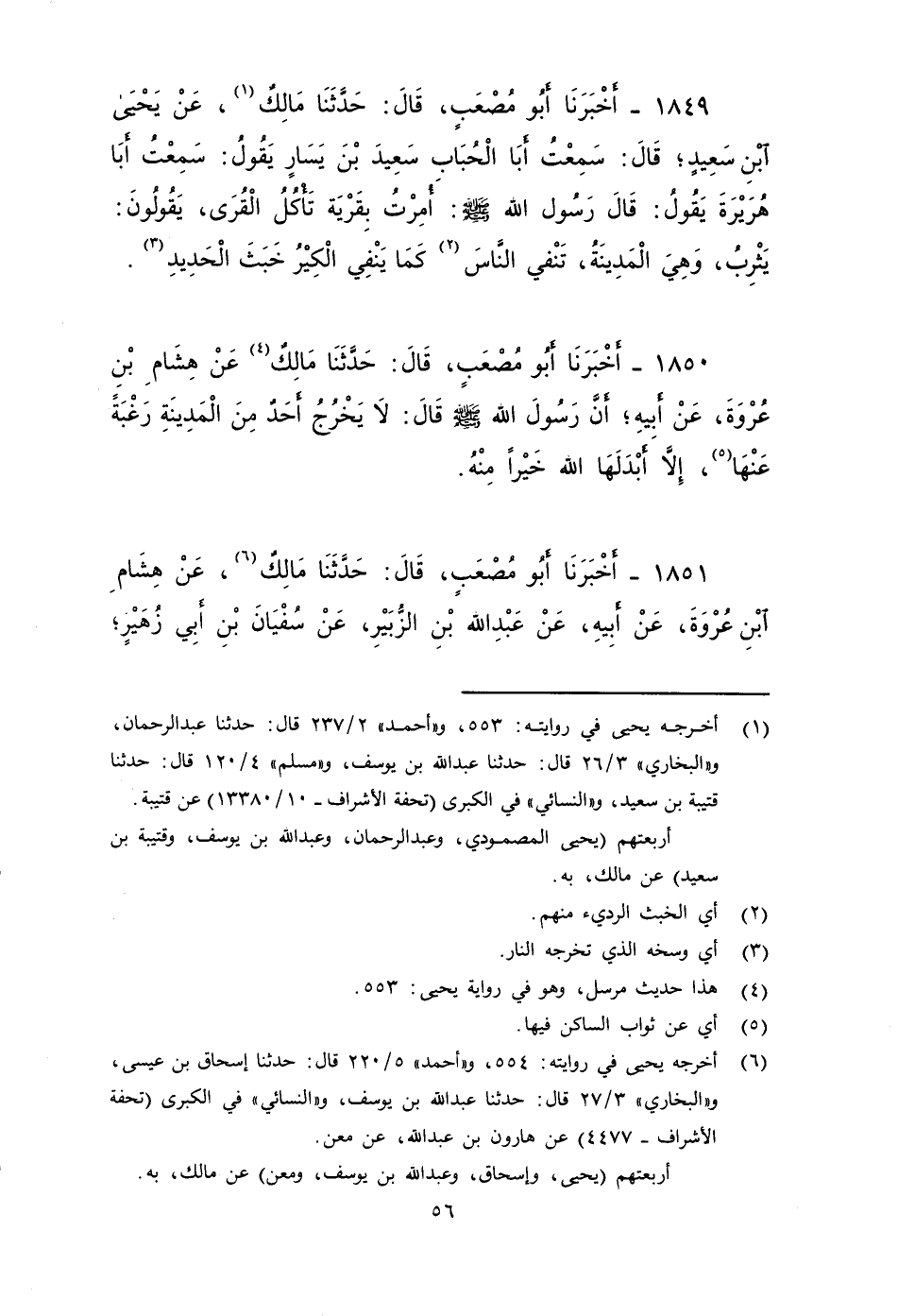 ١٨٤٩ - أَخْبَرَنَا أَبُو مُصْعَبٍ، قَالَ: حَدَّثَنَا مَالِكٌ، عَنْ يَحْيَى بْنِ سَعِيدٍ، قَالَ: سَمِعْتُ أَبَا الْحُبَابِ سَعِيدَ بْنَ يَسَارٍ، يَقُولُ: سَمِعْتُ أَبَا هُرَيْرَةَ، يَقُولُ: قال رَسُولَ اللَّهِ صَلى الله عَلَيه وَسَلم: أُمِرْتُ بِقَرْيَةٍ تَأْكُلُ الْقُرَى يَقُولُونَ يَثْرِبُ وَهِيَ الْمَدِينَةُ، تَنْفِي النَّاسَ كَمَا يَنْفِي الْكِيرُ خَبَثَ الْحَدِيدِ.