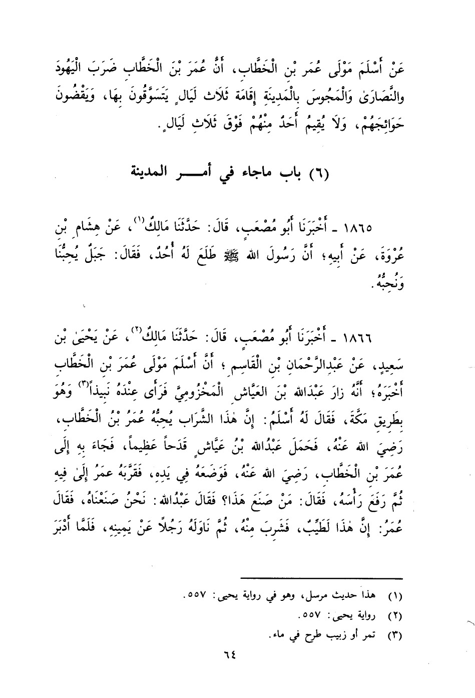 ١٨٦٦ - أَخْبَرَنَا أَبُو مُصْعَبٍ، قَالَ: حَدَّثَنَا مَالِكٌ، عَنْ يَحْيَى بْنِ سَعِيدٍ، عَنْ عَبْدِ الرَّحْمَنِ بْنِ الْقَاسِمِ، أَنَّ أَسْلَمَ , مَوْلَى عُمَرَ بْنِ الْخَطَّابِ أَخْبَرَهُ، أَنَّهُ زَارَ عَبْدَ اللهِ بْنَ العَيَّاشٍ الْمَخْزُومِيَّ , فَرَأَى عِنْدَهُ نَبِيذًا، وَهُوَ بِطَرِيقِ مَكَّةَ، فَقَالَ لَهُ أَسْلَمُ: إِنَّ هَذَا الشَّرَابَ يُحِبُّهُ عُمَرُ بْنُ الْخَطَّابِ - رضي الله عنه -، فَحَمَلَ عَبْدُ اللهِ بْنُ عَيَّاشٍ قَدَحًا عَظِيمًا، فَجَاءَ بِهِ إِلَى عُمَرَ بْنِ الْخَطَّابِ - رضي الله عنه - , فَوَضَعَهُ فِي يَدِهِ، فَقَرَّبَهُ عُمَرُ إِلَى فِيهِ، ثُمَّ رَفَعَ رَأْسَهُ , فَقَالَ: من صنع هذا فقال عبد الله: نحن صنعناه فقال عمر: إِنَّ هَذَا لَطَيِّبٌ، فَشَرِبَ مِنْهُ، ثُمَّ نَاوَلَهُ رَجُلاً عَنْ يَمِينِهِ، فَلَمَّا أَدْبَرَ عَبْدُ اللهِ بن عياش, نَادَاهُ عُمَرُ بْنُ الْخَطَّابِ فَقَالَ: أنْتَ الْقَائِلُ: لَمَكَّةُ خَيْرٌ مِنَ الْمَدِينَةِ؟ فَقَالَ عَبْدُ اللهِ، قُلْتُ: هِيَ حَرَمُ اللهِ وَأَمْنُهُ، وَفِيهَا بَيْتُهُ، فَقَالَ عُمَرُ: لَا أَقُولُ فِي حَرَمِ اللهِ , وَلَا فِي أمنه شَيْئًا، ثُمَّ قَالَ: أَنْتَ الْقَائِلُ: مَكَّةُ خَيْرٌ مِنَ الْمَدِينَةِ، قَالَ: فَقُلْتُ: هِيَ حَرَمُ اللهِ وَأَمْنُهُ، وَفِيهَا بَيْتُهُ، فَقَالَ عُمَرُ: لَا أَقُولُ فِي حَرَمِ اللهِ , وَلَا فِي أمنه شَيْئًا , ثُمَّ انْصَرَفَ.