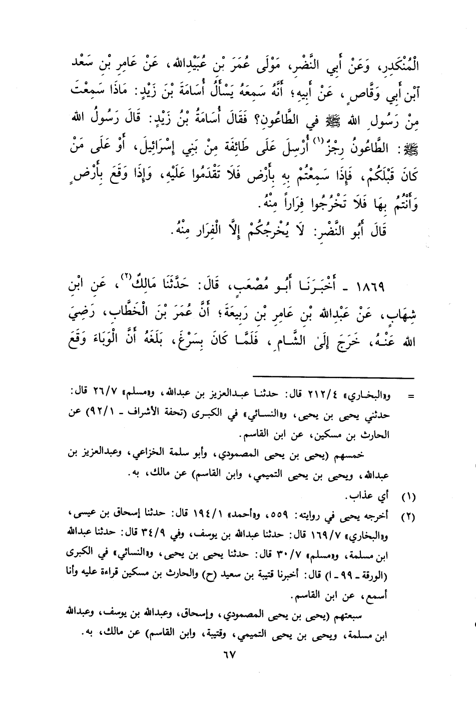 ١٨٦٨ - أَخْبَرَنَا أَبُو مُصْعَبٍ، قَالَ: حَدَّثَنَا مَالِكٌ، عَنْ مُحَمَّدِ بْنِ الْمُنْكَدِرِ، وَعَنْ أَبِي النَّضْرِ مَوْلَى عُمَرَ بْنِ عُبَيْدِ اللَّهِ، عَنْ عَامِرِ بْنِ سَعْدِ بْنِ أَبِي وَقَّاصٍ، عَنْ أَبِيهِ، أَنَّهُ سَمِعَهُ يَسْأَلُ أُسَامَةَ بْنَ زَيْدٍ، مَا سَمِعْتَ مِنْ رَسُولِ اللَّهِ صَلى الله عَلَيه وَسَلم فِي الطَّاعُونِ؟ فَقَالَ أُسَامَةُ: قَالَ رَسُولُ اللَّهِ صَلى الله عَلَيه وَسَلم: الطَّاعُونُ رِجْزٌ أُرْسِلَ عَلَى طَائِفَةٍ مِنْ بَنِي إِسْرَائِيلَ أَوْ عَلَى مَنْ كَانَ قَبْلَكُمْ، فَإِذَا سَمِعْتُمْ بِهِ بِأَرْضٍ فَلَا تقدموا عَلَيْهِ، وَإِذَا وَقَعَ بِأَرْضٍ وَأَنْتُمْ بِهَا فَلَا تَخْرُجُوا فِرَارًا مِنْهُ.