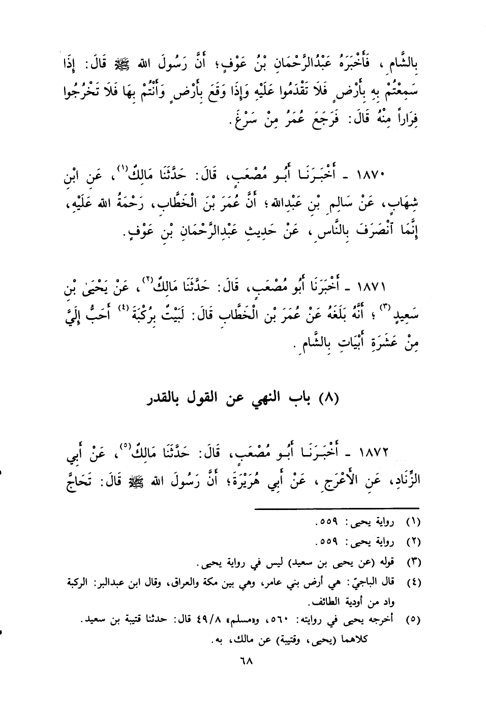 ١٨٧٠ - أَخْبَرَنَا أَبُو مُصْعَبٍ، قَالَ: حَدَّثَنَا مَالِكٌ، عَنِ ابْنِ شِهَابٍ، عَنْ سَالِمِ بْنِ عَبْدِ اللهِ، أَنَّ عُمَرَ بْنَ الْخَطَّابِ - رحمة الله عليه - , إِنَّمَا انصرف بِالنَّاسِ عَنْ حَدِيثِ عَبْدِ الرَّحْمَنِ بْنِ عَوْفٍ.