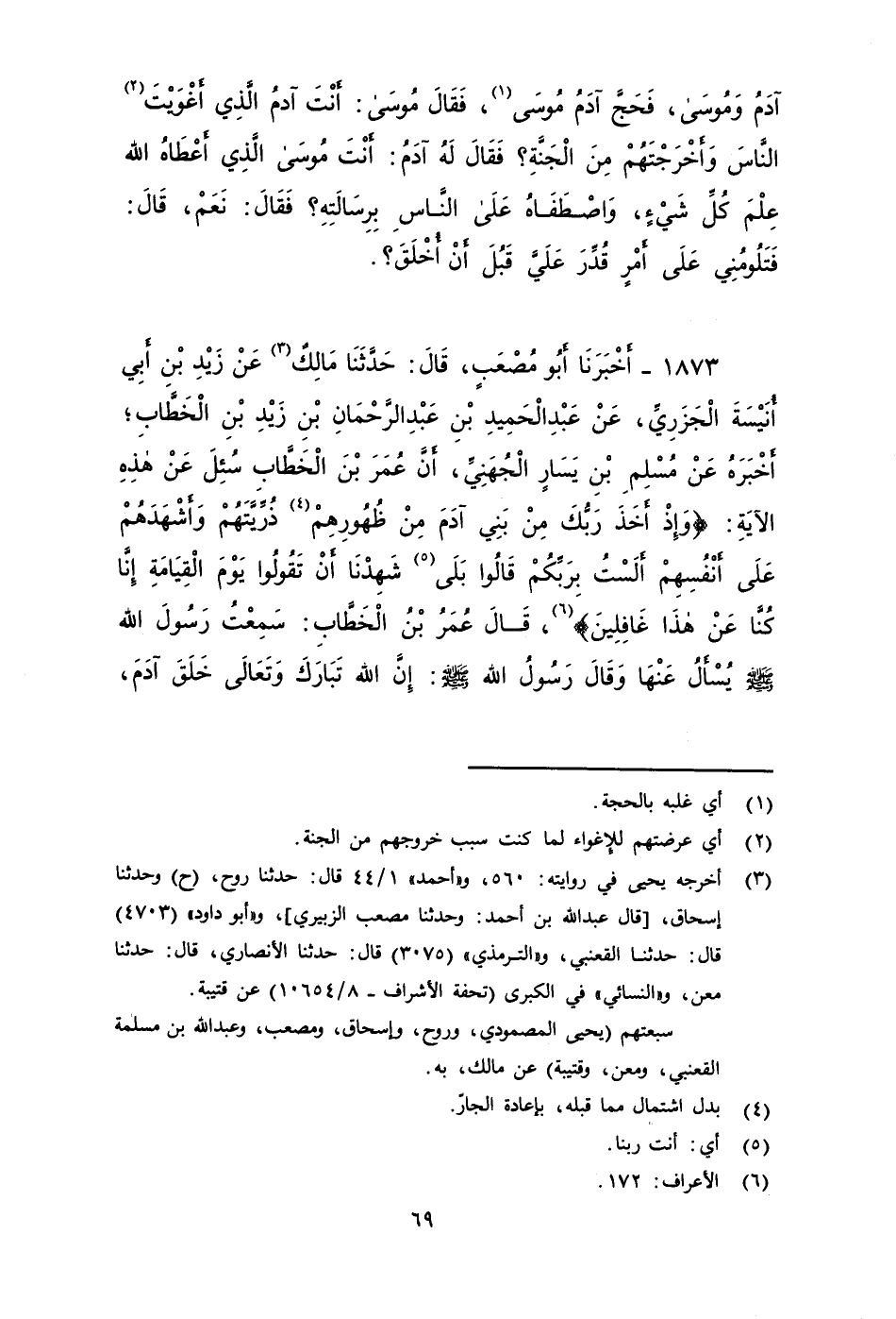 ١٨٧٣ - أَخْبَرَنَا أَبُو مُصْعَبٍ، قَالَ: حَدَّثَنَا مَالِكٌ، عَنْ زَيْدِ بْنِ أَبِي أُنَيْسَةَ الجزري، عَنْ عَبْدِ الْحَمِيدِ بْنِ عَبْدِ الرَّحْمَنِ بْنِ زَيْدِ بْنِ الْخَطَّابِ أَخْبَرَهُ، عَنْ مُسْلِمِ بْنِ يَسَارٍ الْجُهَنِيِّ: أَنَّ عُمَرَ بْنَ الْخَطَّابِ سُئِلَ عَنْ هَذِهِ الْآيَةِ: {وَإِذْ أَخَذَ رَبُّكَ مِنْ بَنِي آدَمَ مِنْ ظُهُورِهِمْ ذُرِّيَّتَهُمْ وَأَشْهَدَهُمْ عَلَى أَنْفُسِهِمْ أَلَسْتُ بِرَبِّكُمْ قَالُوا بَلَى شَهِدْنَا أَنْ تَقُولُوا يَوْمَ الْقِيَامَةِ إِنَّا كُنَّا عَنْ هَذَا غَافِلِينَ} ، قَالَ عُمَرُ بْنُ الْخَطَّابِ: سَمِعْتُ رَسُولَ اللَّهِ صَلى الله عَلَيه وَسَلم يُسْأَلُ عَنْهَا، وقَالَ رَسُولُ اللَّهِ صَلى الله عَلَيه وَسَلم: إِنَّ اللَّهَ تَبَارَكَ وَتَعَالَى خَلَقَ آدَمَ ثُمَّ مَسَحَ على ظَهْرَهُ بِيَمِينِهِ فَاسْتَخْرَجَ مِنْهُ ذُرِّيَّةً، فَقَالَ: خَلَقْتُ هَؤُلَاءِ لِلْجَنَّةِ وَبِعَمَلِ أَهْلِ الْجَنَّةِ يَعْمَلُونَ، ثُمَّ مَسَحَ ظَهْرَهُ فَاسْتَخْرَجَ مِنْهُ ذُرِّيَّةً، فَقَالَ: خَلَقْتُ هَؤُلَاءِ لِلنَّارِ وَبِعَمَلِ أَهْلِ النَّارِ يَعْمَلُونَ، فَقَالَ رَجُلٌ: يَا رَسُولَ اللَّهِ فَفِيمَ الْعَمَلُ؟ فَقَالَ رَسُولُ اللَّهِ صَلى الله عَلَيه وَسَلم: إِنَّ اللَّهَ تبارك وتعالى إِذَا خَلَقَ الْعَبْدَ لِلْجَنَّةِ اسْتَعْمَلَهُ بِعَمَلِ أَهْلِ الْجَنَّةِ حَتَّى يَمُوتَ عَلَى عَمَلٍ مِنْ أَعْمَالِ أَهْلِ الْجَنَّةِ فَيُدْخِلُهُ بُّهُ الْجَنَّةَ، وَإِذَا خَلَقَ الْعَبْدَ لِلنَّارِ اسْتَعْمَلَهُ بِعَمَلِ مِنْ أَعْمَالِ أَهْلِ النَّارِ حَتَّى يَمُوتَ عَلَى عَمَلٍ مِنْ أَعْمَالِ أَهْلِ النَّارِ فَيُدْخِلُهُ بُّهُ النَّارَ.