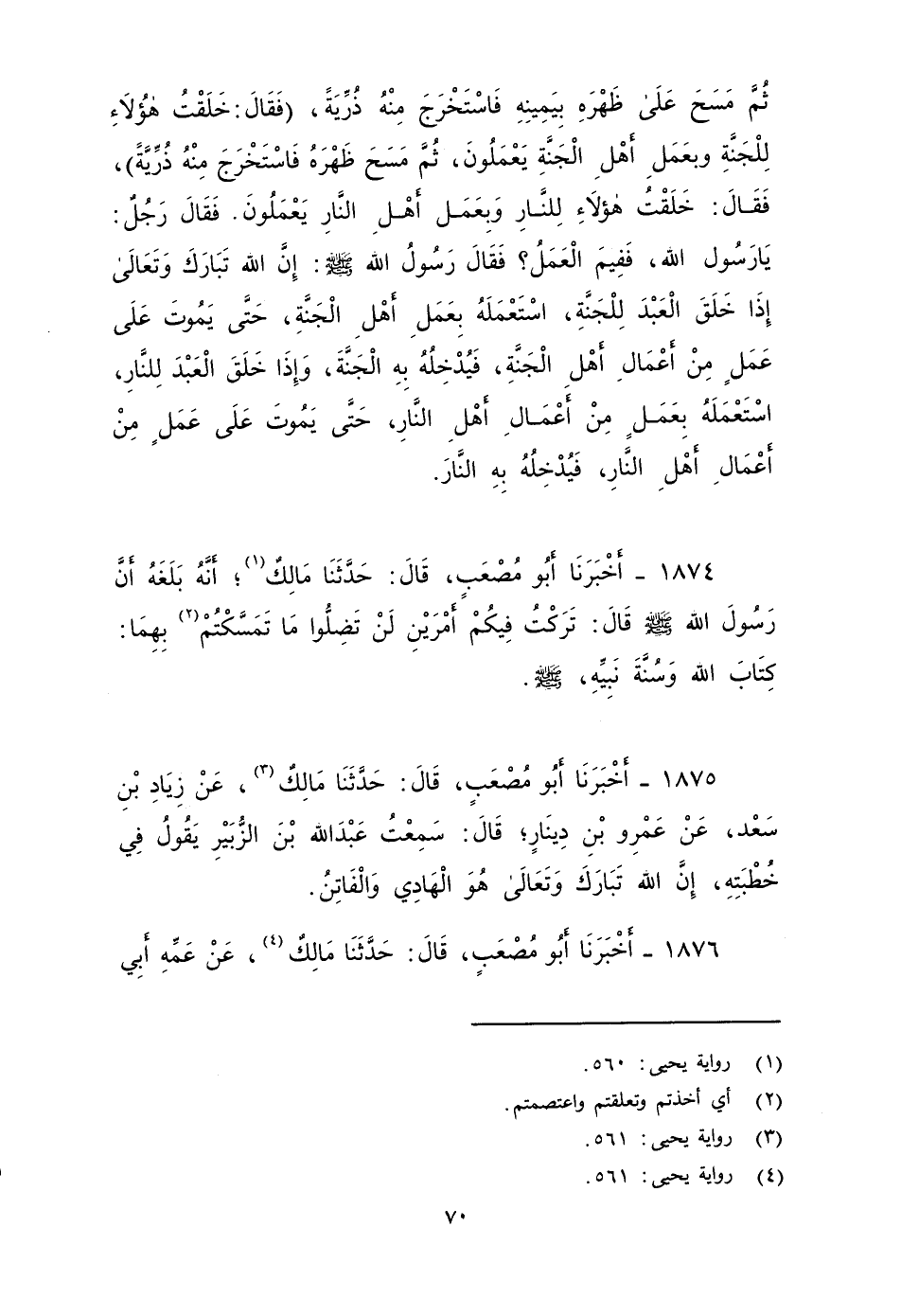 ١٨٧٤ - أَخْبَرَنَا أَبُو مُصْعَبٍ، قَالَ: حَدَّثَنَا مَالِكٌ؛ أَنَّهُ بَلَغَهُ، أَنَّ رَسُولَ اللهِ صَلَّى اللَّهُ عَلَيْهِ وَسَلَّمَ قَالَ: تَرَكْتُ فِيكُمْ أَمْرَيْنِ، لَنْ تَضِلُّوا مَا تَمَسَّكْتُمْ بِهِمَا: كِتَابَ اللهِ , وَسُنَّةَ نَبِيِّهِ صَلى الله عَلَيه وَسَلم.