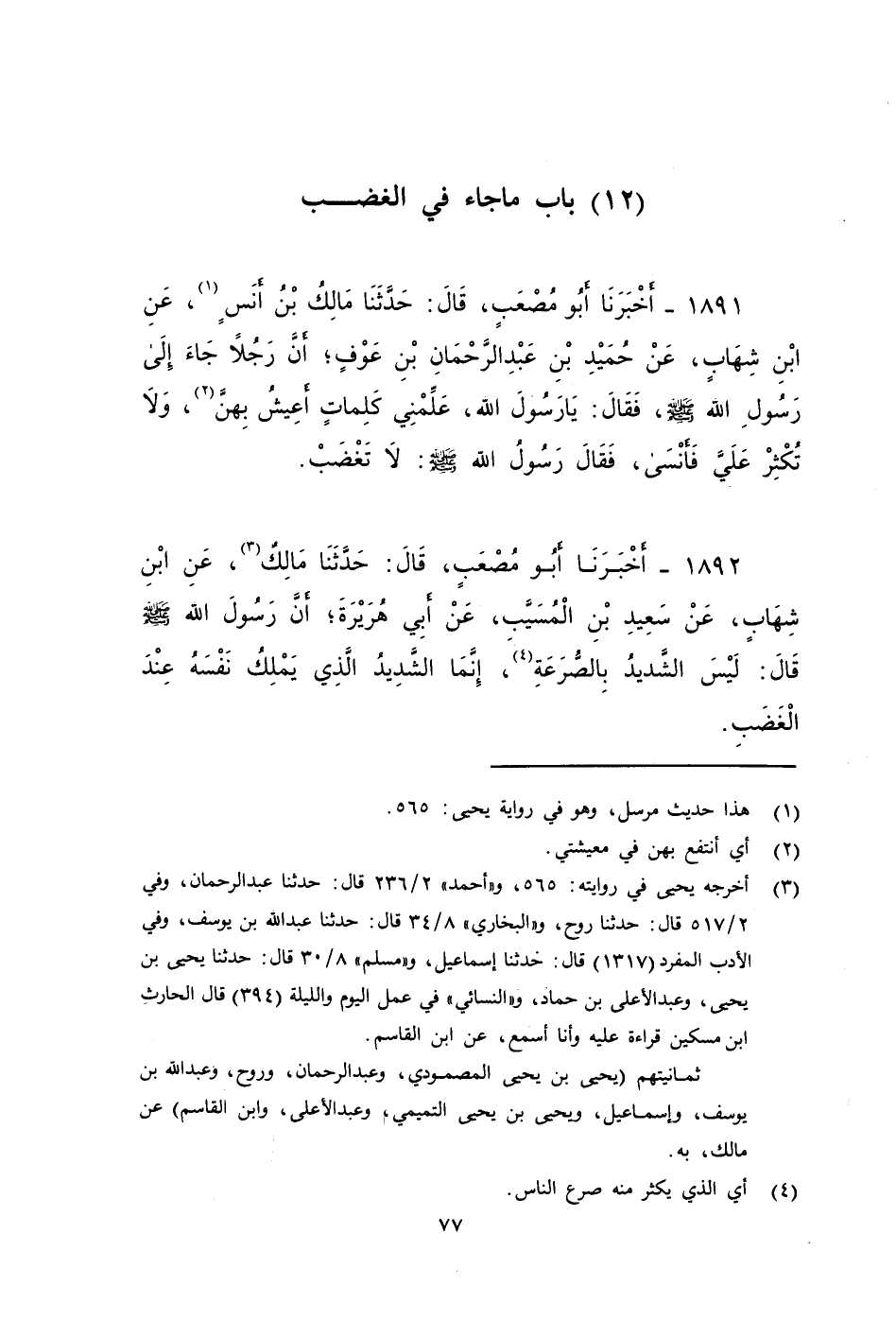 ١٨٩١ - أَخْبَرَنَا أَبُو مُصْعَبٍ، قَالَ: حَدَّثَنَا مَالِكُ بْنُ أَنَسٍ، عَنْ ابْنِ شِهَابٍ، عَنْ حُمَيْدِ بْنِ عَبْدِ الرَّحْمَنِ بْنِ عَوْفٍ، أَنَّ رَجُلًا جاء إِلَى رَسُولِ اللَّهِ صَلى الله عَلَيه وَسَلم، فَقَالَ: يَا رَسُولَ اللَّهِ عَلِّمْنِي كَلِمَاتٍ أَعِيشُ بِهِنَّ وَلَا تُكْثِرْ عَلَيَّ فَأَنْسَى، فَقَالَ رَسُولُ اللَّهِ صَلى الله عَلَيه وَسَلم: لا تَغْضَبْ.