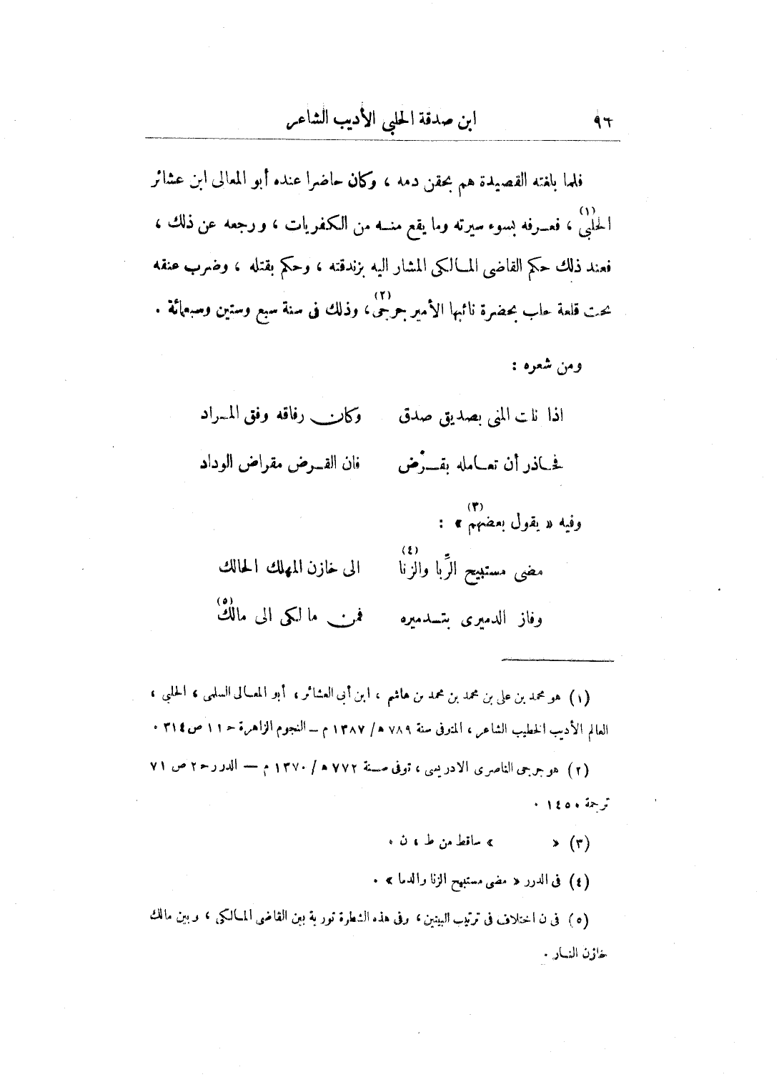 نقيب الأشراف بحلب، وكاتب الإنشاء بِهَا، وأحد أعيانها سؤدداً ورئاسة، وكرماً وفضلاً، مع رياضة أخلاق وتواضع وإحسان لمن يرد عَلَيْهِ، وَلَمْ يزل عَلَى ذَلِكَ إِلَى أن مات بحلب " فِي " سنة ثمان وسبعين وسبعمائة، رحمه الله تعالى.