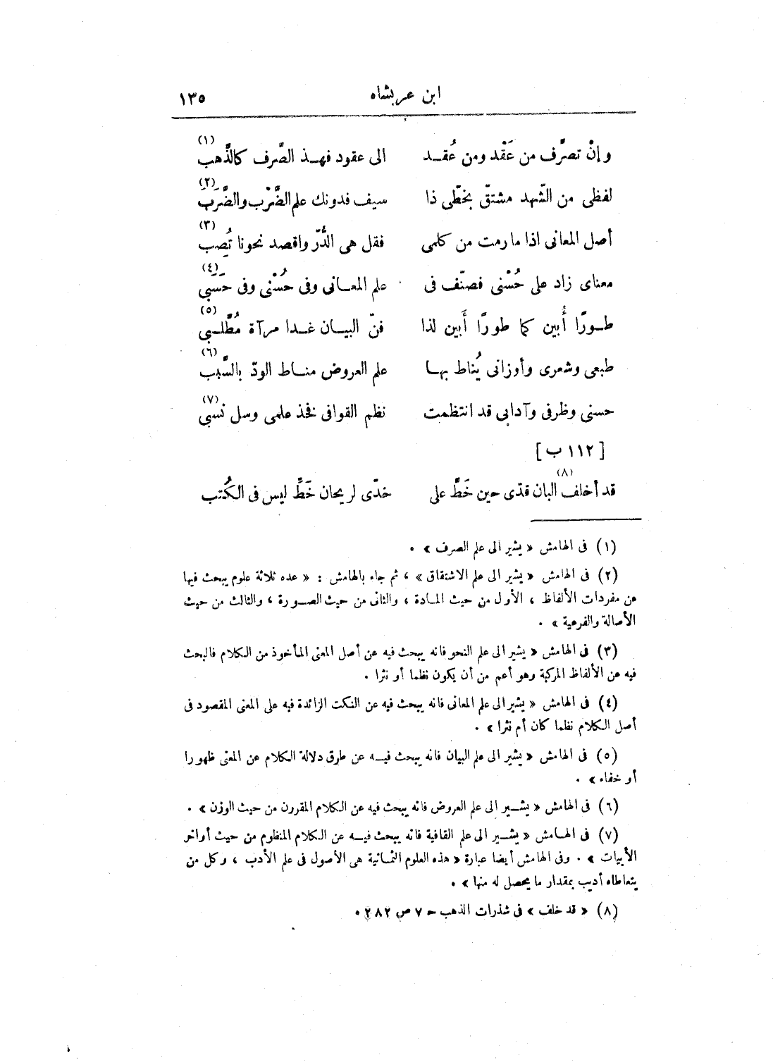 ومن مصنفاتي المنثورة تاريخ تمرلنك عجائب المقدور فِي نوائب تيمور، ومنها فاكهة الخلفاء ومفاكهة الظرفاء، ومنها خطاب الإهاب الناقب وجواب الشهاب الثاقب، ومنها الترجمان بمنتهى الإرب فِي لغة الترك والعجم والعرب، ومن النظم القصيدة المسماة بالعقود أولها: