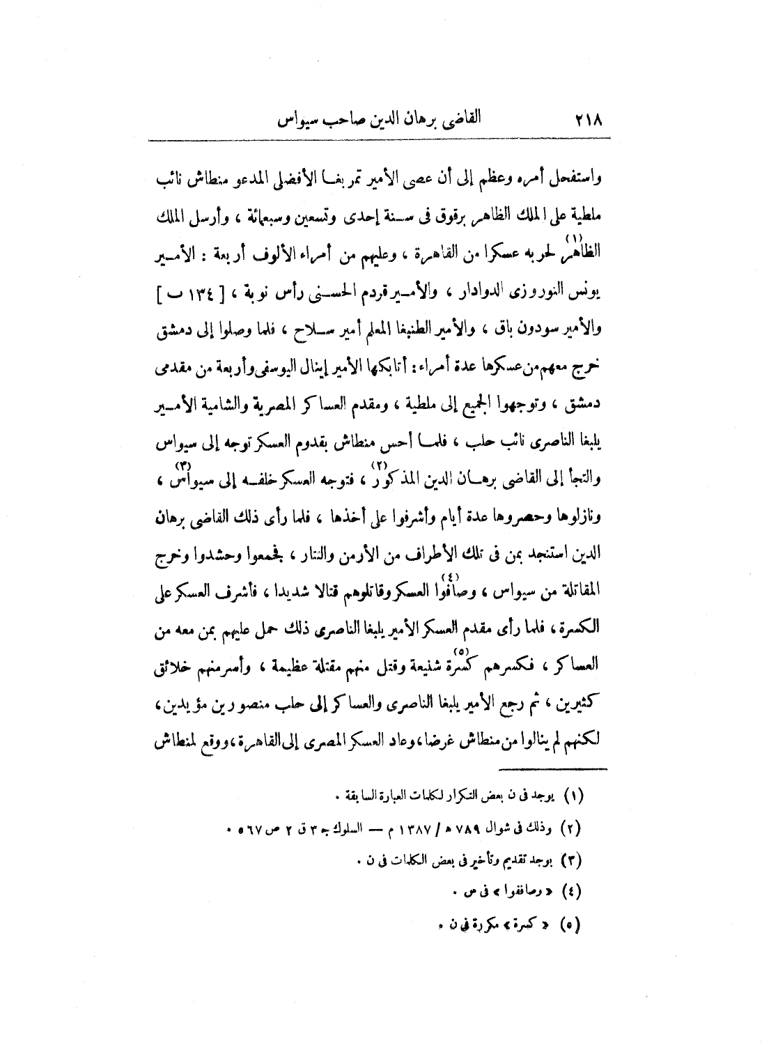 وعشرين وسبعمائة، فعظم ملكه، ثم قدم إلى " مصر " واستفحل أرتنا أحد أمرائه عَلَى بلاد الروم، فنزل سيواس وعملها كرسي ملكه، حَتَّى مات سنة ثلاث وخمسين، وملك بعده ابنه وأولاده، " فأخذ أولاد " دلغادر النزكماني بلاد سيس، ومات محمد بن أرتنا في حدود سنة ثمانين، فأقيم بعده صبي من أولاده، وقام بأمره " الأمير " القليج أرسلان فغدر به قاضي سيواس، وقام بأمر الصبي حَتَّى مات، وهو والد برهان صاحب الترجمة.