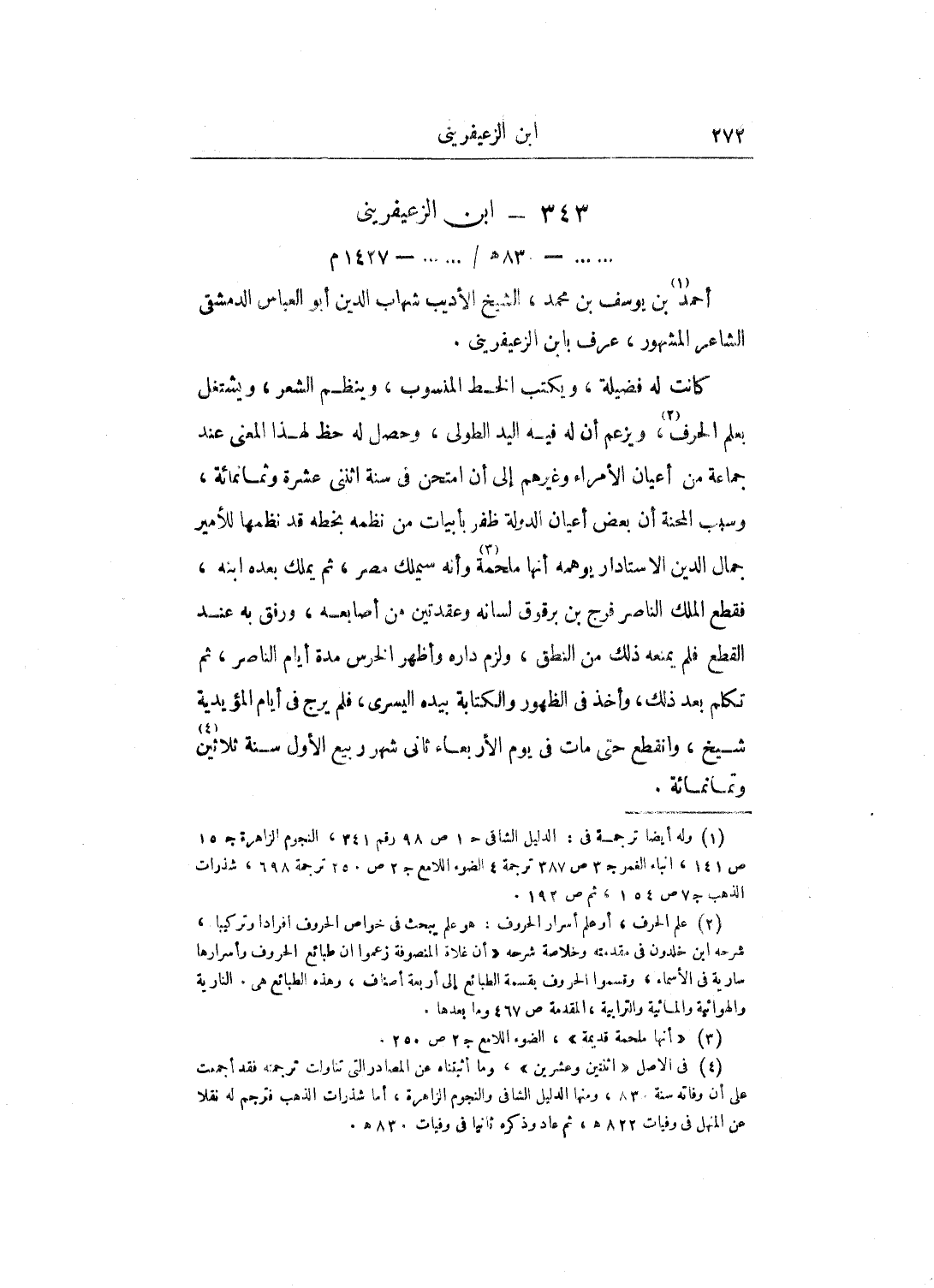 وأخبرني من لفظه الحافظ فتح الدين محمد بن سيد الناس قال: كان ابن الصاحب يعاشر الفارس آقطاي، فاتفق أنهم كانوا يوماً عَلَى ظهر النيل في شختور. وكان الملك الظاهر بيبرس مع الفارس آقطاي وجرى بينهم أمر، ثم ضرب الدهر ضرباته، وركب الظاهر يوماً إلى الميدان ولم يكن عمر قنطرة السباع، وكان التوجه إلى الميدان عَلَى باب زويلة عَلَى باب الخرق، وكان ابن الصاحب ذَلِكَ اليوم نائماً عَلَى قفص صيرفي من تلك الصيارف، برا باب زويلة، ولم يكن أحد يتعرض لابن الصاحب، فلم يشعر الظاهر إلا وابن الصاحب يضرب بمفتاح في يده عَلَى خشب الصيرفي ضرباً قوياً فالتفت فرآه، فقال هاه علم الدين، فقال إيش علم الدين، أنا جيعان، فقال: أعطوه ثلاثة آلاف درهم، وكان ابن الصاحب أشار بتلك الدقة عَلَى الخشب إلى دقة مثلها يوم المركب. انتهى كلام الصفدي.
