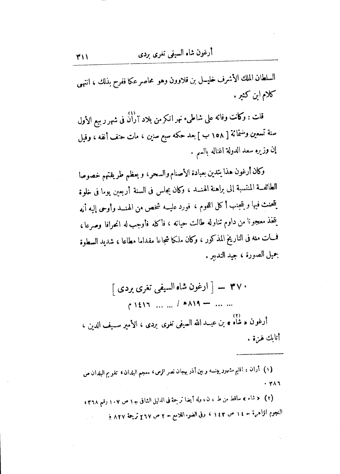 وسبعة مماليك وثمانمائة ثوب وبرخطائي، من أملاك بو سعيد الموروثة له عن أبيه وجده، من جدهم جنكزخان من تلك البلاد، فنم عَلَى الخطائي لبوسعيد فصادره وأخذ منه مائة ألف دينار ثم إن بو سعيد كرهه لذلك فأعطاه لدمشق خجا بن جوبان، فكأن ذَلِكَ لم يهن عليه، فنم إلى بوسعيد أيضاً بأمر دمشق خجا مع الخاتون طقطاي، وجرى من أمرهما ما جرى من حز رأسها، ثم إن بوسعيد أرتجع أرغون شاه ثم بعثه إلى الملك الناصر هو والأمير ملكتمر السعيدي، فحظي الأمير أرغون شاه عند الناصر وأمّره وجعله رأس نوبة، وزوجه ببنت الأمير آقبغا عبد الواحد، ولم يزل بمصر إلى أن أخرج مع الفخري لحصار الكرك، ثم توجه مع العساكر الشامية إلى القاهرة.