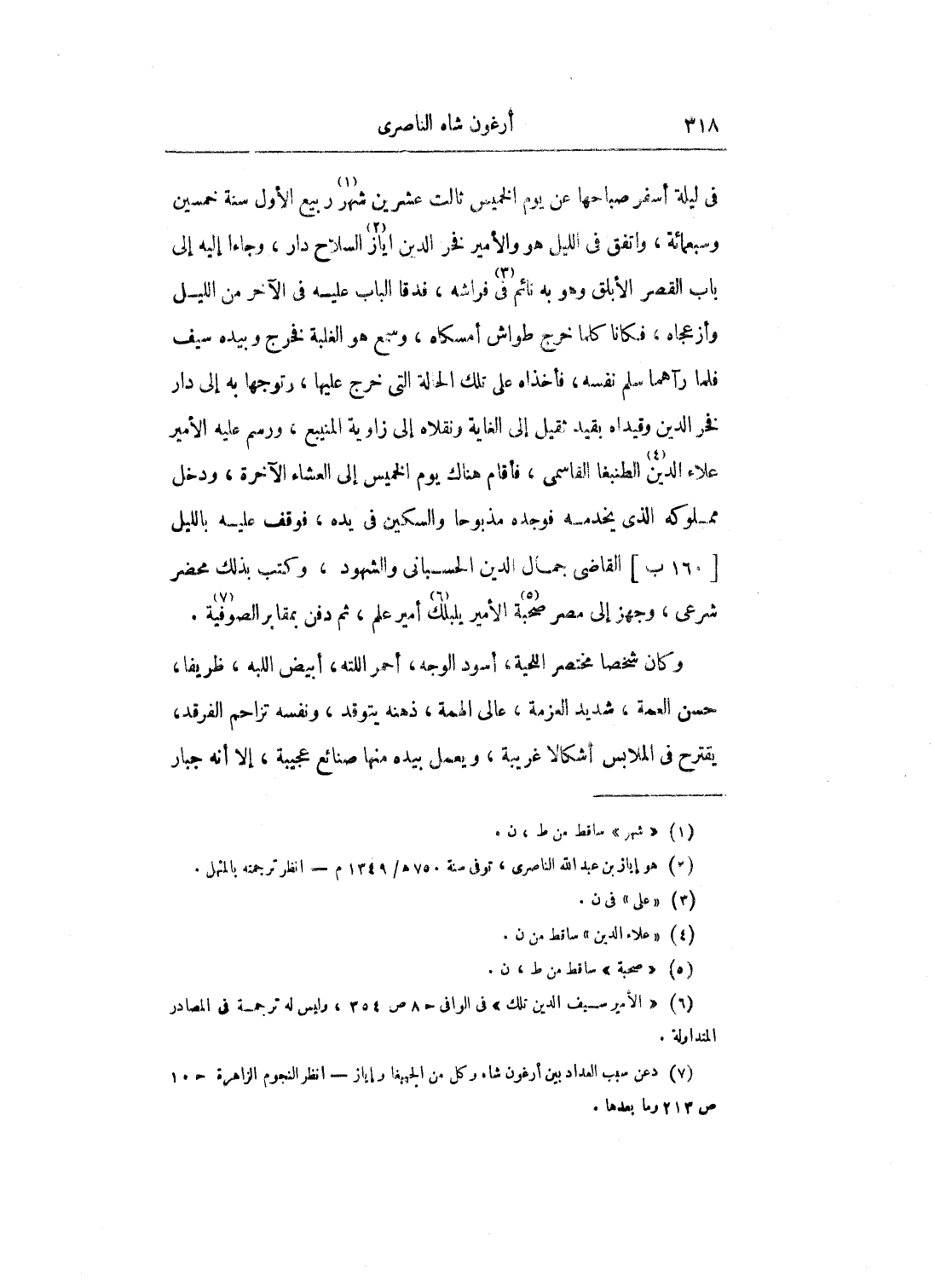 وخمسين وسبعمائة، ودام في نيابة دمشق إلى أن خرج الأمير بيبغا أروس وأحمد الساقي نائب حماه وبكلمش نائب طرابلس عَلَى الملك الصالح، فولى أرغون هذا نيابة حلب عوضاً عن بيبغا أروس ثانياً في سنة ثلاث وخمسين وسبعمائة، واستمر بها مدة، وعمر البيمارستان الذي داخل باب قنسرين وأحكم بناءه، ووقف عليه عدة أوقاف، وفيه يقول الأديب بدر الدين بن حبيب: