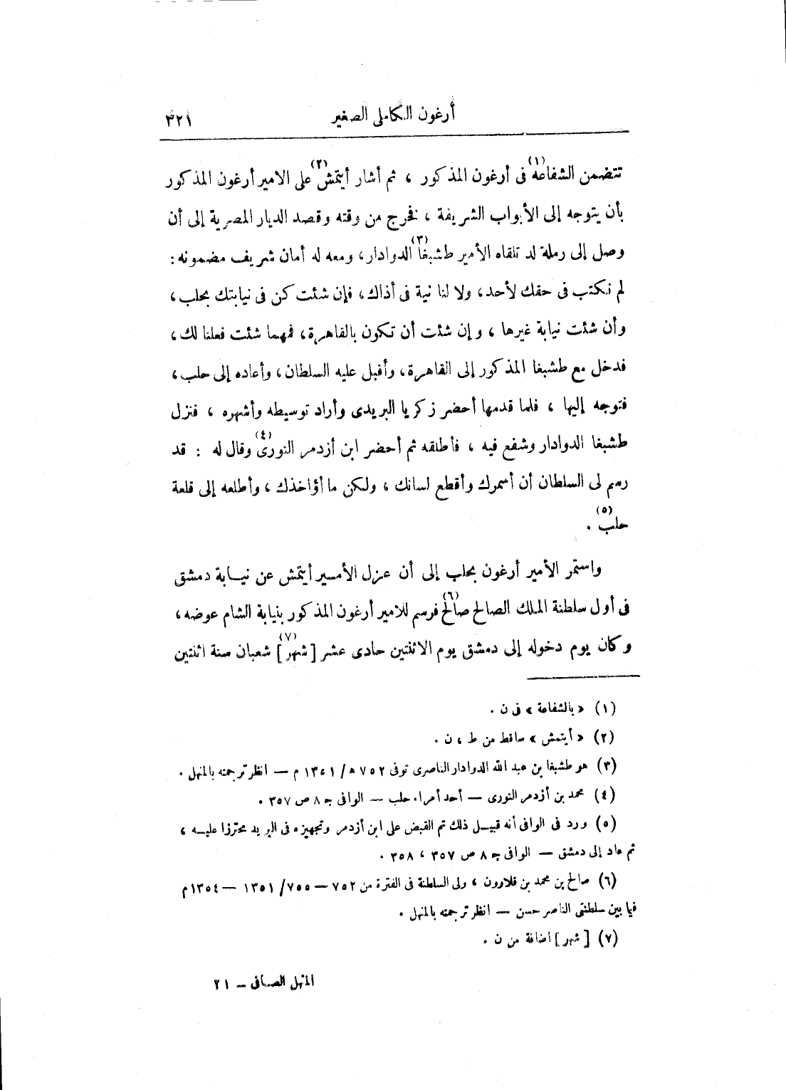 واستمر أرغون شاه في المصادرة إلى عاشر الشهر المذكور وأفرج عنه من غير عقوبة ثم نفى إلى دمشق بعد مدة، فدام بدمشق إلى أن استقدمه الملك الظاهر ططر صحبته إلى الديار المصرية، فدام بها إلى أن ولى الاستادارية من قبل الأمير برسباي الدقماقي مدبر مملكة الملك الصالح محمد بن الملك