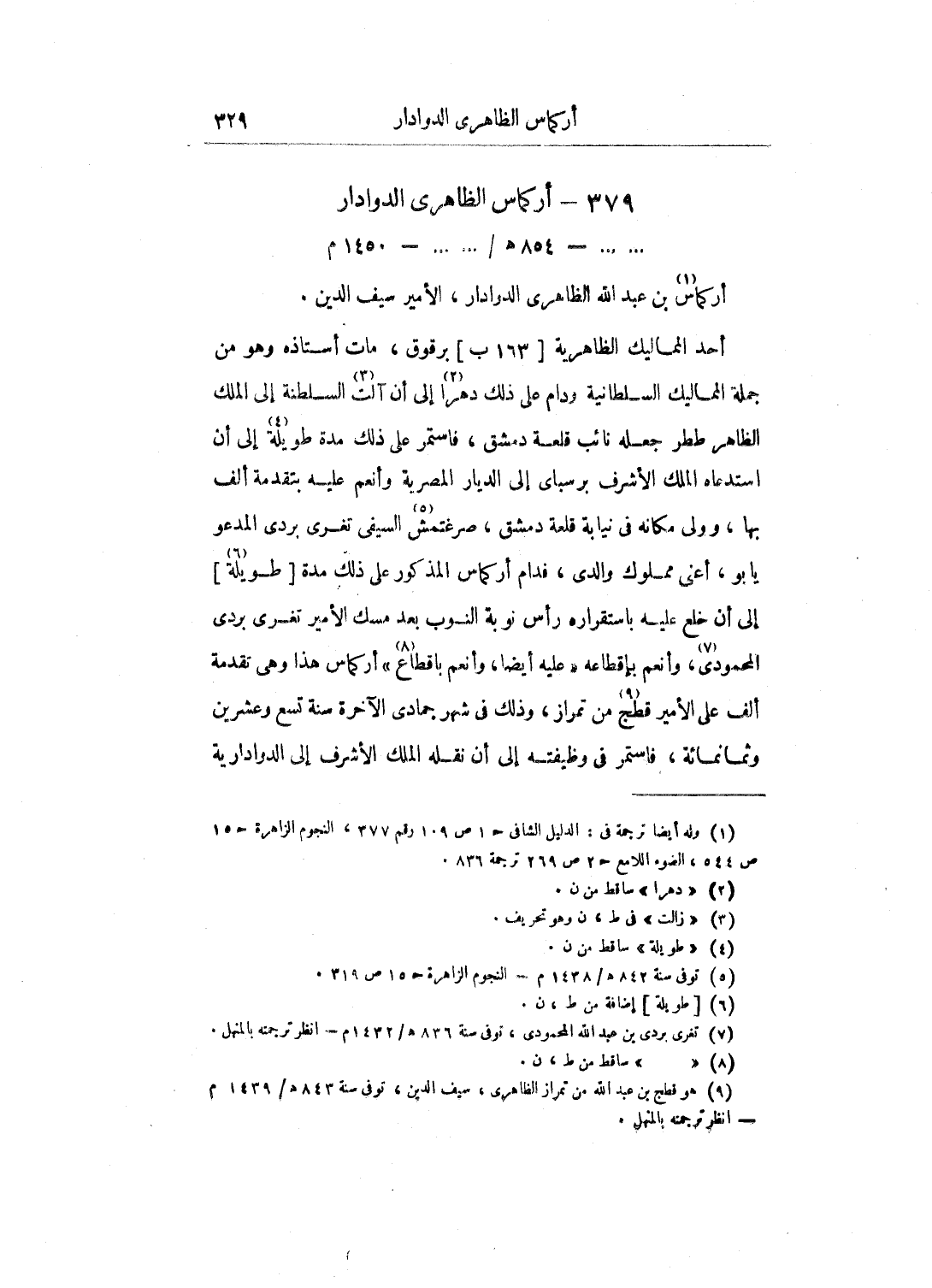 الزردكاش المتنقل إلى نيابة طرابلس، فدام المذكور في نيابة غزة إلى أن نقله الأتابك ططر مدير مملكة الملك المظفر أحمد بن الملك المؤيد شيخ إلى نيابة طرابلس بعد عزل شاهين الزردكاش، وتولى من بعده غزة، الأمير يونس الركني الخازندار أتابك دمشق ثانياً وذلك في سنة أربع وعشرين وثمانمائة، فأقام أركماس الجلباني في نيابة طرابلس مدة يسيرة، وطلب إلى الأبواب الشريفة بعد موت الظاهر ططر فامتنع وخرج عن الطاعة، وتوجه إلى جهة حلب، فلم ينتج أمره، وأمسك وحبس بقلعة حلب إلى أن أفرج عنه في سنة خمس وعشرين وتوجه إلى الحجاز بطالا، وأقام بالمدينة الشريفة نحو عام، ثم عاد إلى القدس فأقام به نيفاً عَلَى عشر سنين، ثم ولى نظر الحرمين بالقدس والخليل عليه السلام، ثم بعد سنة ست وثلاثين ولى نيابة القدس مضافاً للنظر، وعزل وأنعم عليه بإمرة مائة وتقدمه ألف بدمشق، فباشر إمرته بدمشق أياماً، وخرج إلى بعض النواحي الجارية في إقطاعه فمرض ومات بالرملة فحمل إلى القدس ودفن به وذلك في سنة سبع وثلاثين، أو التي بعدها تخميناً، وثمانمائة، رحمه الله.