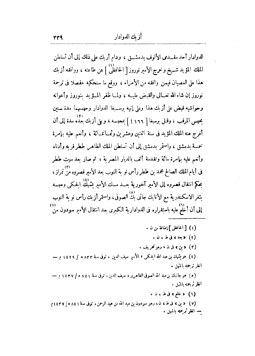 أحد المماليك الظاهرية برقوق، وأحد أمراء الطبلخاناه في الدولة الناصرية فرج إلى أن توفي ليلة الثلاثاء رابع عشر ربيع الأول سنة ست وثمانمائة، رحمه الله تعالى.