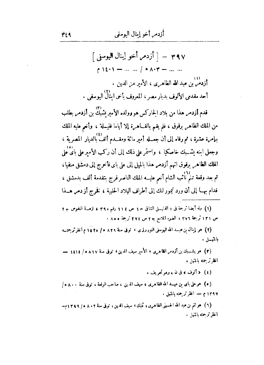 الظاهر ططر، وأنعم عليه بإمرة طبلخاناه، ثم صار من جملة أمراء الألوف في أوائل سلطنة الملك الأشرف برسباي، ودام عَلَى ذَلِكَ سنين إلى أن أخرج لنيابة ملطية في سنين الثلاثين وثمانمائة، فباشر النيابة مدة يسيرة فلم تحمد سيرته وعزل، وصار حاجباً بحلب إلى أن توفي بحلب في سادس شهر ربيع الآخر سنة إحدى وثلاثين وثمانمائة.