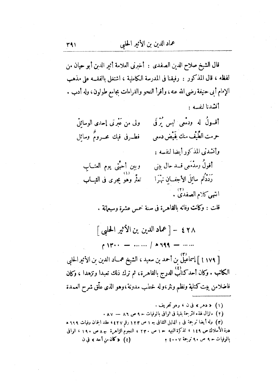 كما قيل طويل ولحيتك طويلة، فضحك من ذَلِكَ الملك الناصر، فقال عماد الدين لذلك الصالح إلا أني ما ربيت في مدينة حمص، وقاما وافترقا في ذَلِكَ اليوم من غير عمل مصلحة، واستمر بعد ذَلِكَ الملك الصالح بحمص إلى أن قتل في وقعة هولاكو بيد التتار في أوائل سنة تسع وخمسين وستمائة.
