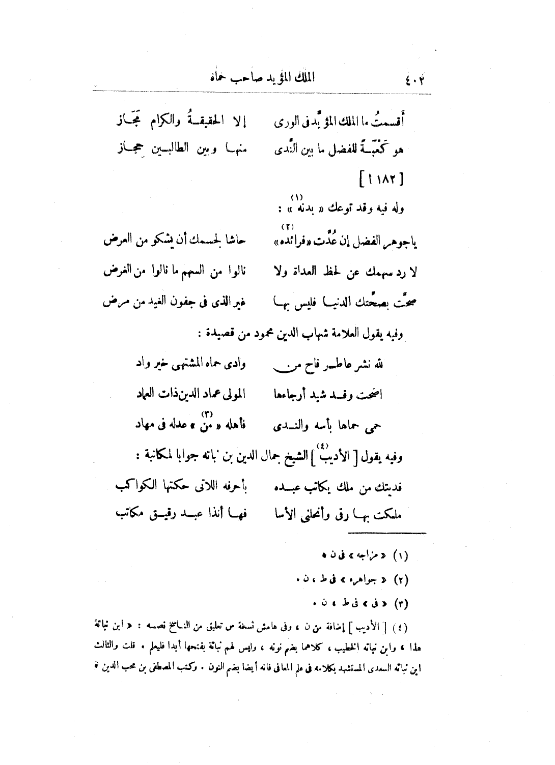 محمود بن حماد الحموي كاتب السر بحماه لمخدومه السلطان الملك المؤيد ونحن بين يديه وهو أحسن ما سمعته في معناه: