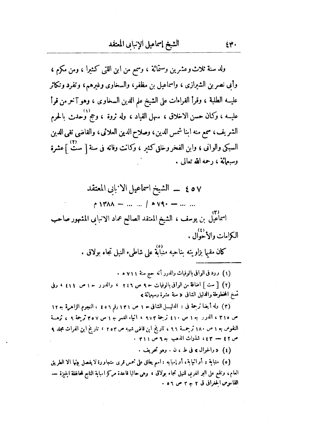 قلت: ودام أسنباي هذا بخدمة تيمورلنك إلى أن مات في سنة سبع وثمانمائة، ووقع الخلف بين أولاده، فعند ذَلِكَ خرج من العجم عائداً إلى الديار المصرية، وقدم إلى القاهرة، واستمر بها إلى أن تسلطن الملك المؤيد جعله من جملة أمراء العشرات وزردكاشا كبيراً، واختص به، واستمر مقرباً عنده إلى أن مات المؤيد وآل الأمر إلى الملك الظاهر ططر، عزله من الزردكاشية بالأمير قجقار جغتاي السيفي بكتمر جلق، واستمر أسنباي المذكور من جملة أمراء العشرات إلى أواخر الدولة الأشرفية برسباي، نقل إلى نيابة دمياط فاستمر بها إلى أن تسلطن الملك الظاهر جقمق، عزل وطلب إلى القاهرة، وصار كما كان أولاً عَلَى إمرته، إلى أن توفي سنة اثنتين وخمسين وثمانمائة، وله نحو تسعين سنة. وهو مستمتع بحواسه.