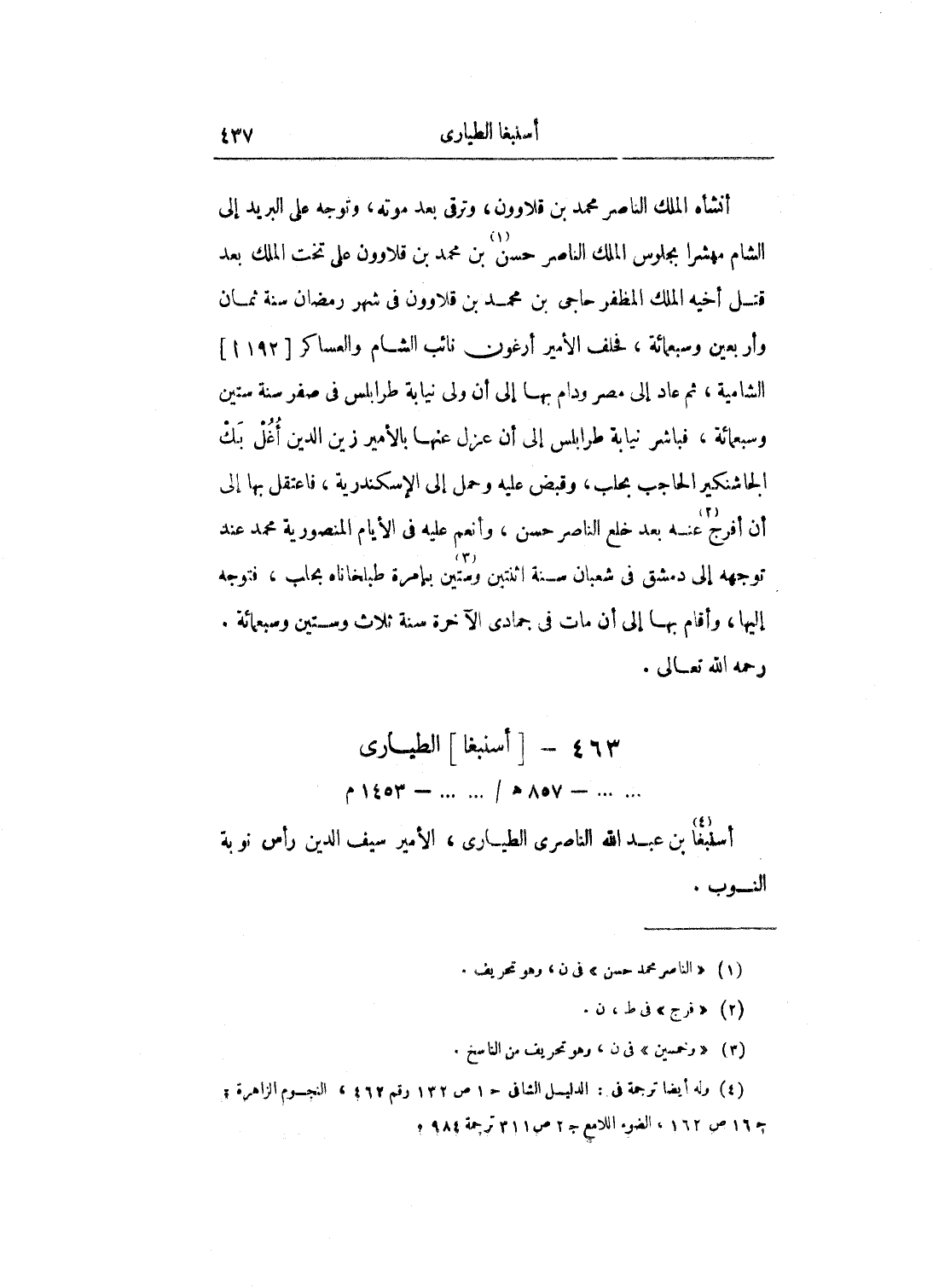 أمراء آخر، هم أصحاب الحل والعقد في المملكة، وهم أسندمر هذا، وطغيتمر النظامي، وآقبغا جلب الأحمدي، وقجماس الطازي، فأقاموا عَلَى ذَلِكَ مدة ثم وقع بينهم الخلف، فصار أسندمر وحده، وانضم هؤلاء الثلاثة إلى الملك الأشرف شعبان، وانضم عَلَى أسندمر جماعة من الأمراء ومن مماليك يلبغا، إلى أن كانت ليلة الأحد سابع شهر شوال سنة ثمان وستين وسبعمائة، ركب الأمراء جميعهم نصف الليل، ونزل السلطان معهم، ودقت الكوسات، وكان قصد الأمراء مسك أسندمر الناصري هذا، ومسك بعض مماليك يلبغا الأشرار، فلم يركب أسندمر إلى طلوع الشمس، ثم ركب من الكبش بمن معه وراح إلى قبة الصفراء ونزل إلى القرافة، وطلع من خلف القلعة، ولم يعلم به الأمراء إلا وهو تحت الطبلخاناه السلطانية، فهرب أكثر الأمراء إلا الجاي اليوسفي وأرغون تتر فهما ثبتا وقاتلا بمن معهما إلى قريب الظهر، فلم يردفهما أحد من الأمراء،