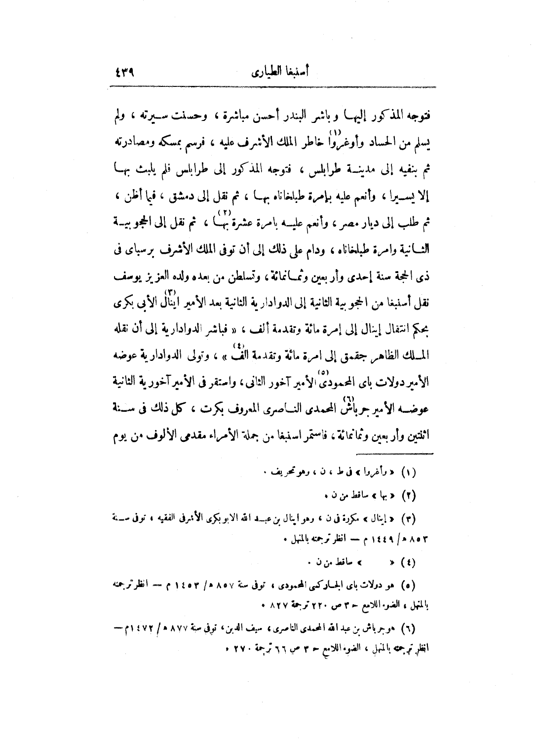 الأمراء والسلطان، وكان أسندمر أخذ جماعة وطلع من خلف القلعة كما فعل في تلك المرة الأولى فانكسرت مماليك يلبغا قبل وصوله، فانهزم أسندمر أيضاً، ثم أمسك وجئ به إلى الملك الأشرف، فلما حضر بين يدي السلطان شفعت فيه الأمراء فأطلقه وخلع عليه عَلَى عادته ونزل إلى بيته بالكبش، ورسم أيضاً لابن قوصون أن يكون أتابكا رفيقاً لأسندمر، ونزل خليل ابن قرصون معه صفة الترسيم إلى بيته، فلما نزلا تحالفا وخامرا عَلَى السلطان، وركبا بسوق الخيل من الغد، قاتلا السلطان ساعة، ثم انهزما، وأمسك أسندمر وخليل بن قوصون وجماعة من الأمراء وأرسلوا إلى الإسكندرية، وأطلق من كان بها من الأمراء المسجونين قبل تاريخه، ووقع السيف في مماليك يلبغا وتشتت شملهم، واستمر أسندمر هذا محبوساً إلى أن مات في شهر رمضان سنة تسع وستين وسبعمائة بثغر الإسكندرية، رحمه الله تعالى.