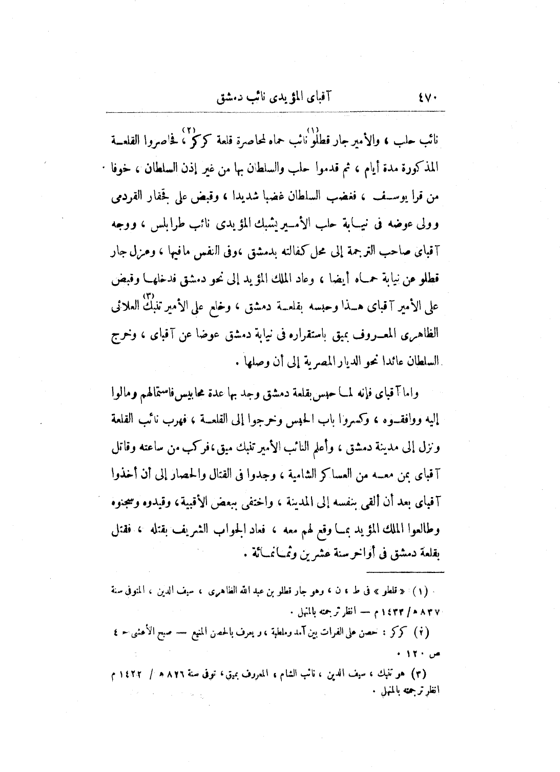 عليه وعلى رفقته من الأمراء والنواب، فكان آقبغا ممن وافقه فقبض عليه أيضاً في سنة اثنتين وثمانمائة، وحبس بقلعة دمشق، وولي نيابة حلب عوضه دمرداش المحمدي، ثم أفرج عنه، وولي نيابة طرابلس بعد الأمير شيخ المحمودي، أعني المؤيد، فدام بطرابلس إلى أن نقل لنيابة دمشق بعد خروج والدي منها خوفاً من القبض عليه وتوجهه إلى حلب، وانضمام الأمير دمرداش نائب حلب عليه وعودة إلى البلاد الشامية، وقتاله مع العسكر السطاني في الواقعة المشهورة في سنة أربع وثمانمائة، فلم تطل أيام آقبغا في نيابة دمشق، وعزل بالأمير شيخ المحمودي، ثم نقل بعد مدة إلى نيابة حلب عوضاً عن الأمير دقماق المحمدي في جمادى الأولى سنة ست وثمانمائة، وأثام بحلب إلى أن مات بها في ليلة الجمعة العشرين من جمادى الآخرة من السنة المذكورة.