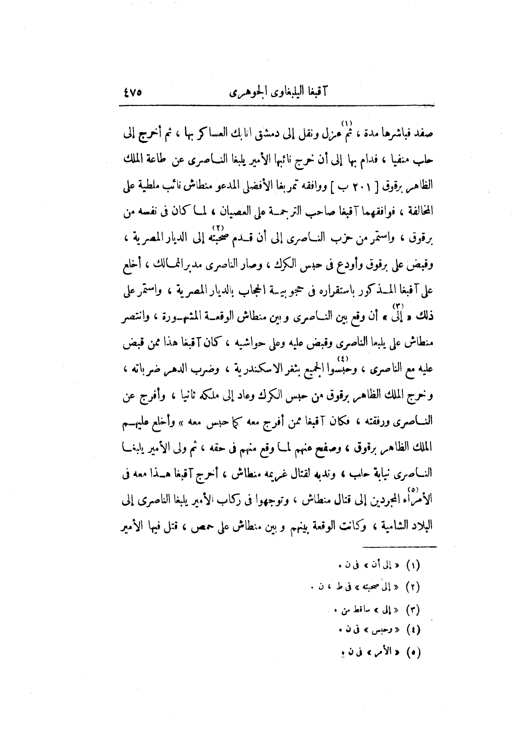 واستمر آقبغا هذا في نيابة دمشق إلى يوم السبت سادس عشر ربيع الآخر سنة ثلاث وأربعين وثمانمائة خرج من حرمه بعد صلاة الصبح وركب وتوجه إلى ميدان دمشق للعب الرمح إلى الميدان ولعب عدة من مماليكه وغير عدة خيول بعد أن أتعبها، ثم ركب إلى لعب الكرة فغير أيضاً عدة خيول أتعبها إلى أن انتهى ما هو فيه من أنواع الفروسية، وطلب مركوبه للموكب، وركبه ومشى به خطوات لقرب باب الميدان، مال عن فرسه فلحقه بعض مماليكه قبل أن يسقط على الأرض، وتكاثروا عليه فحملوه إلى قاعة بالقري من الميدان وهو ميت، ثم نقل إلى دار السعادة في محفة عَلَى أنه مريض، وأقام بها سويعة هنية، وأشيع موته فغسل وصلى عليه، ودفن من يومه بتربة الأمير تنم الحسني نائب دمشق، وسنة نيف عَلَى ستين ستة تخميناً، وكثر أسف الناس عليه، وكانت جنازته مشهودة.