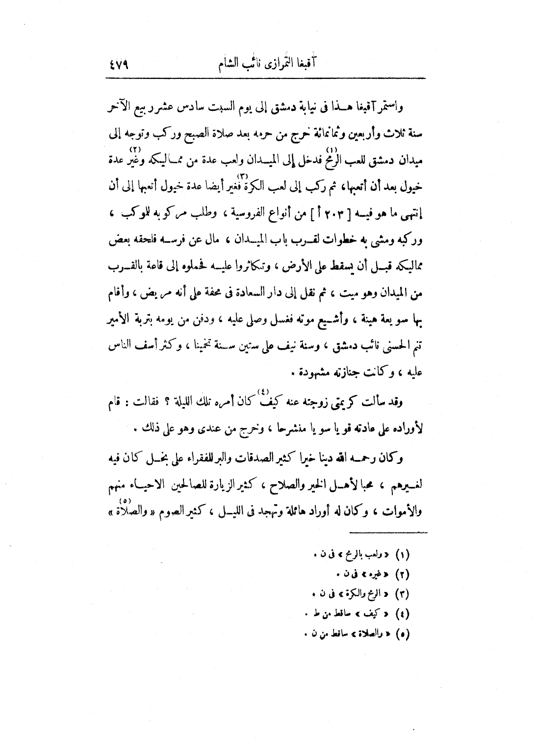 بقلعتها إلى أن نوفي الظاهر برقوق وتسلطن الناصر فرج، وخرج الأمير تنم الحستي نائب الشام عن الطاعة، وأطلق آقبغا هذا وصار من حزبه إلى أن كانت الوقعة، وقبض عَلَى نتم وعلى آقبغا المذكور بعد أن قاتل آقبغا يومئذ قتالاً شديداً وأظهر من الشجاعة ما لا مزيد عليه، فإنه كان في جاليش تنم، وكان والدي هو مقدم العساكر في الجاليش المذكور، وكان آقبغا عَلَى ميسرته ودمرداش المحمدي نائب حلب عَلَى ميمنته، فلما تصاففوا للقتال ووقع العين في العين انهزم دمرداش ومعه الزيني فرج بن منجك بمن معهم من المماليك إلى جهة الملك الناصر طائعين له، وبقى والدي وآقبغا هذا في جمع متوسط لا يمكنهم الرجوع إلى تنم فإنه عَلَى مسافة يريد عنهم إلى خلف، فالتقوا مع العسكر السلطاني، وطال القتال بينهم إلى أن كانت الهزيمة عليهم، وقبض على آقبغا ثم عَلَى والدي فيما بعد، وحبس آقبغا هذا بقلعة دمشق إلى أن قتل بها مع من قتل من الأمراء في رابع عشر شعبان سنة اثنتين وثمانمائة. رحمه الله.