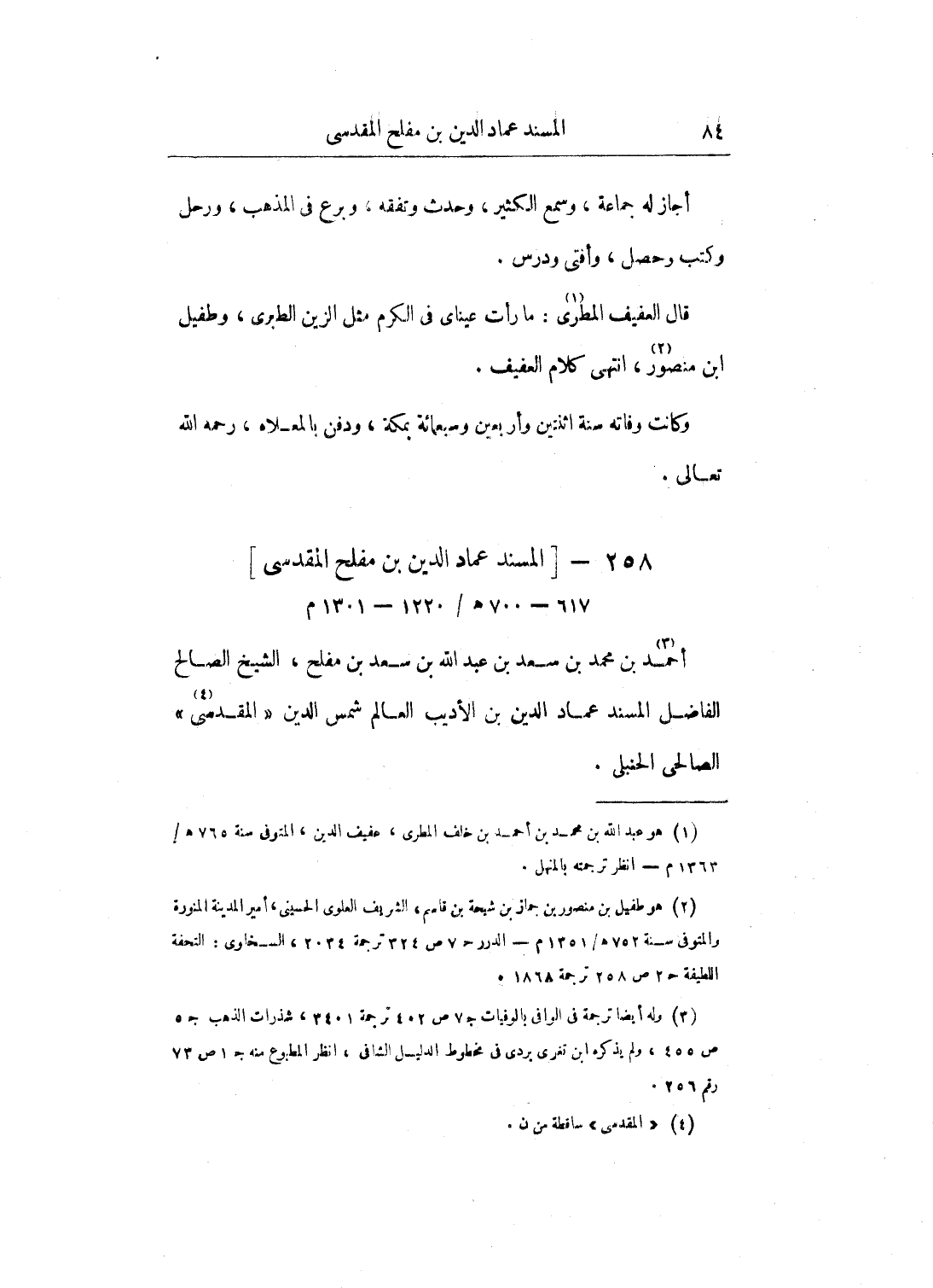 وأطنب الشيخ تقي الدين المقريزي في الثناء عليه وأمعن وزاد، لكونه كان ظاهرياً، مع أنه استرسل في ترجمته " إلى " أن ذكر أشياء يعرف منها أنه كان مخمولاً فقيراً عادماً للقوت.