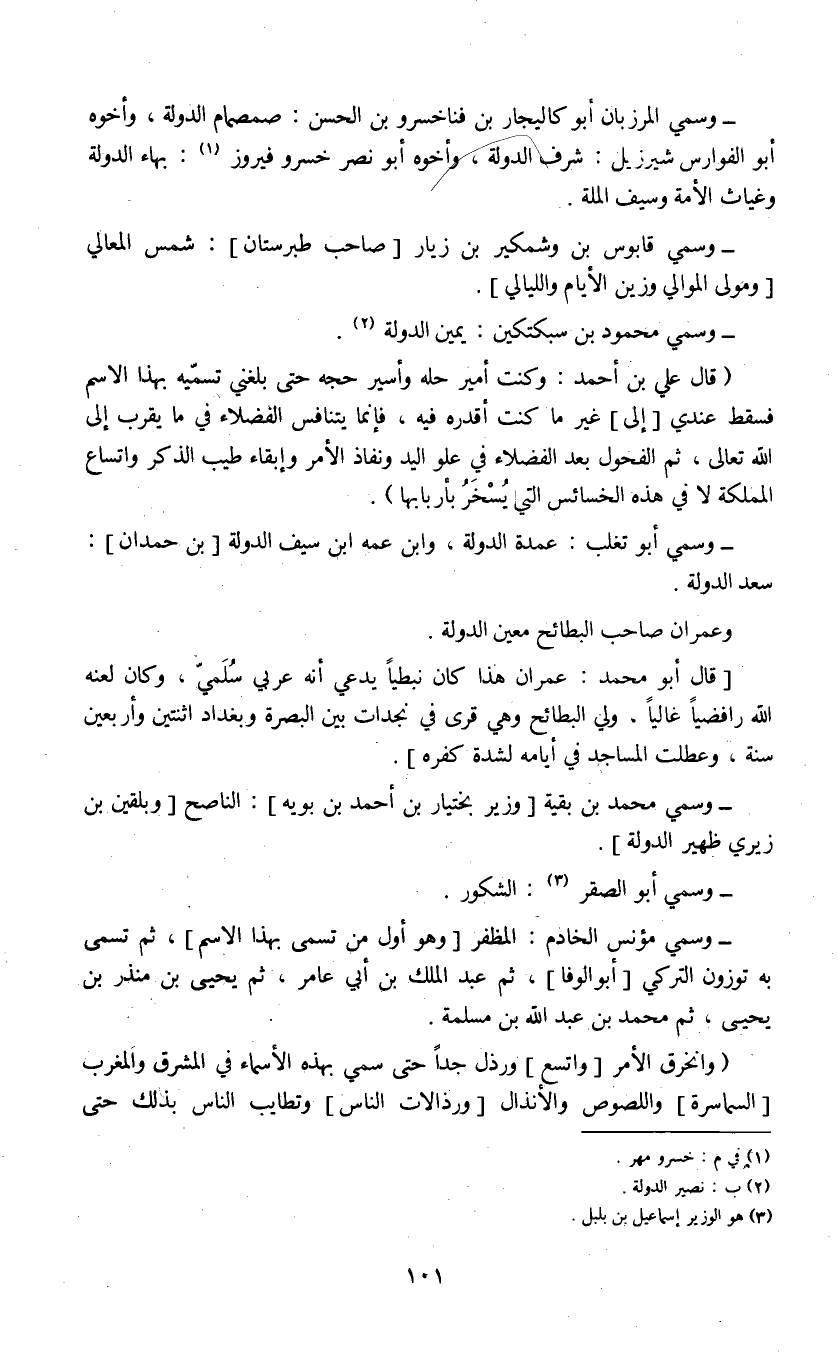 - وسمي المرزبان أبو كاليجار بن فناخسرو بن الحسن: صمصمام الدولة، وأخوه أبو الفوارس شيرزيل: شرف الدولة، وأخوه أبو نصر خسرو فيروز (1) : بهاء الدولة وغياث الأمة وسيف الملة.