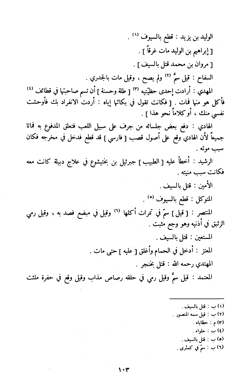 المنتصر: [قيل] سمّ في تمرات أكلها (6) وقيل في مبضع فصد به، وقيل رمي الزئبق في أذنيه وهو وجع مثبت.