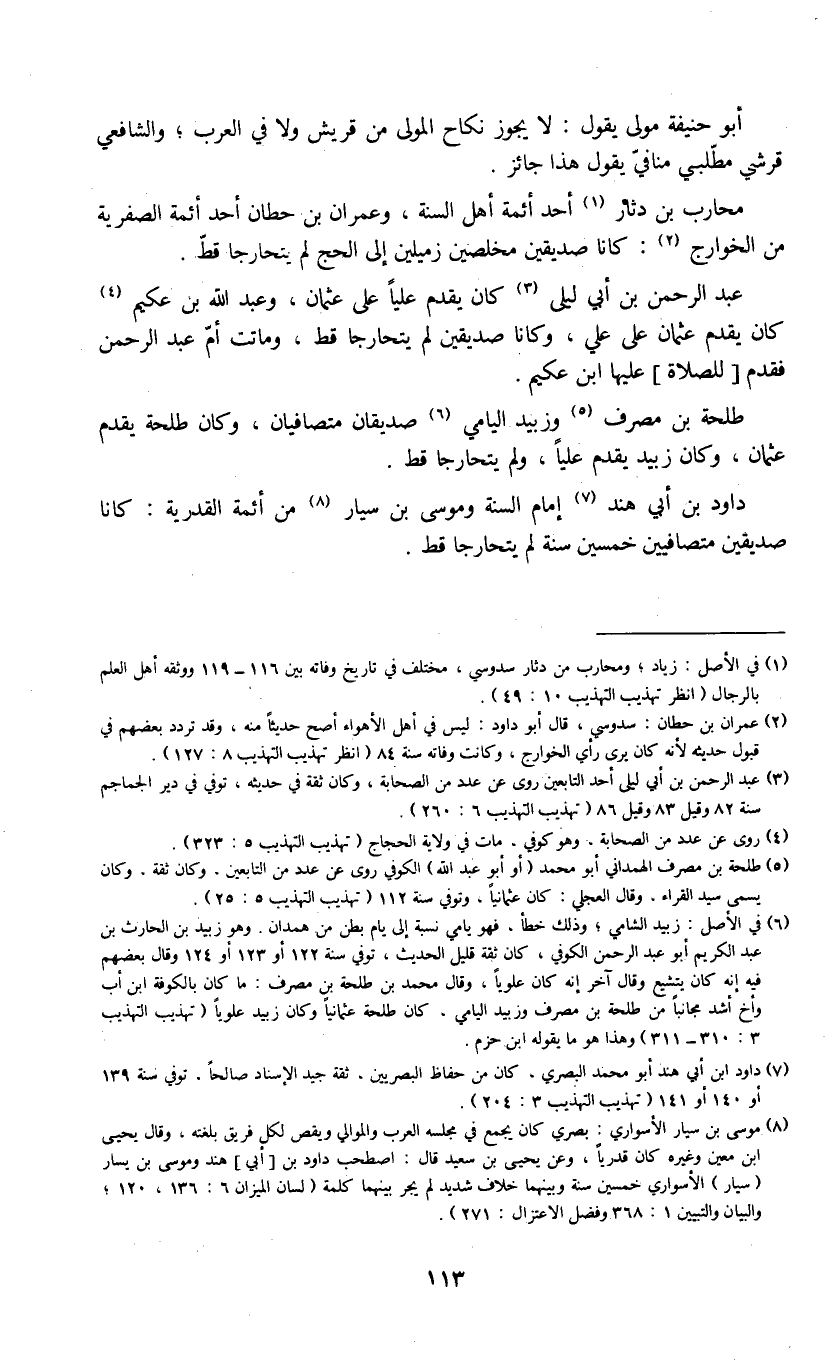 (6) في الأصل: زبيد الشامي؛ وذلك خطأ، فهو يامي نسبة إلى يام بطن من همدان. وهو زبيد بن الحارث بن عبد الكريم أبو عبد الرحمن الكوفي، كان ثقة قليل الحديث، توفي سنة 122 أو 123 أو 124 وقال بعضهم فيه إنه كان يتشيع وقال آخر إنه كان علوياً، وقال محمد بن طلحة بن مصرف: ما كان بالكوفة ابن أب وأخ أشد مجانباً من طلحة بن مصرف وزبيد اليامي، كان طلحة عثمانياً وكان زبيد علوياً (تهذيب التهذيب 3: 310 - 311) وهذا هو ما يقوله ابن حزم.