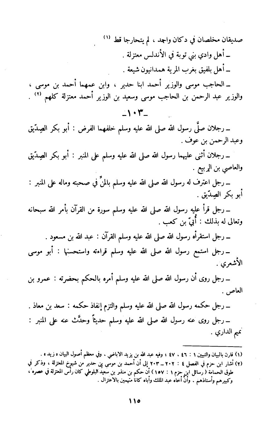 (2) أشار ابن حزم في الفصل 4: 202 - 203 إلى أن أحمد بن موسى بن حدير من شيوخ المعتزلة، وذكر في طوق الحمامة (رسائل ابن حزم 1: 157) أن حكم بن منذر بن سعيد البلوطي كان رأس المعتزلة في عصره، وكبيرهم وأستاذهم، وأن أخاه عبد الملك وأباه كانا متهمين بالاعتزال.