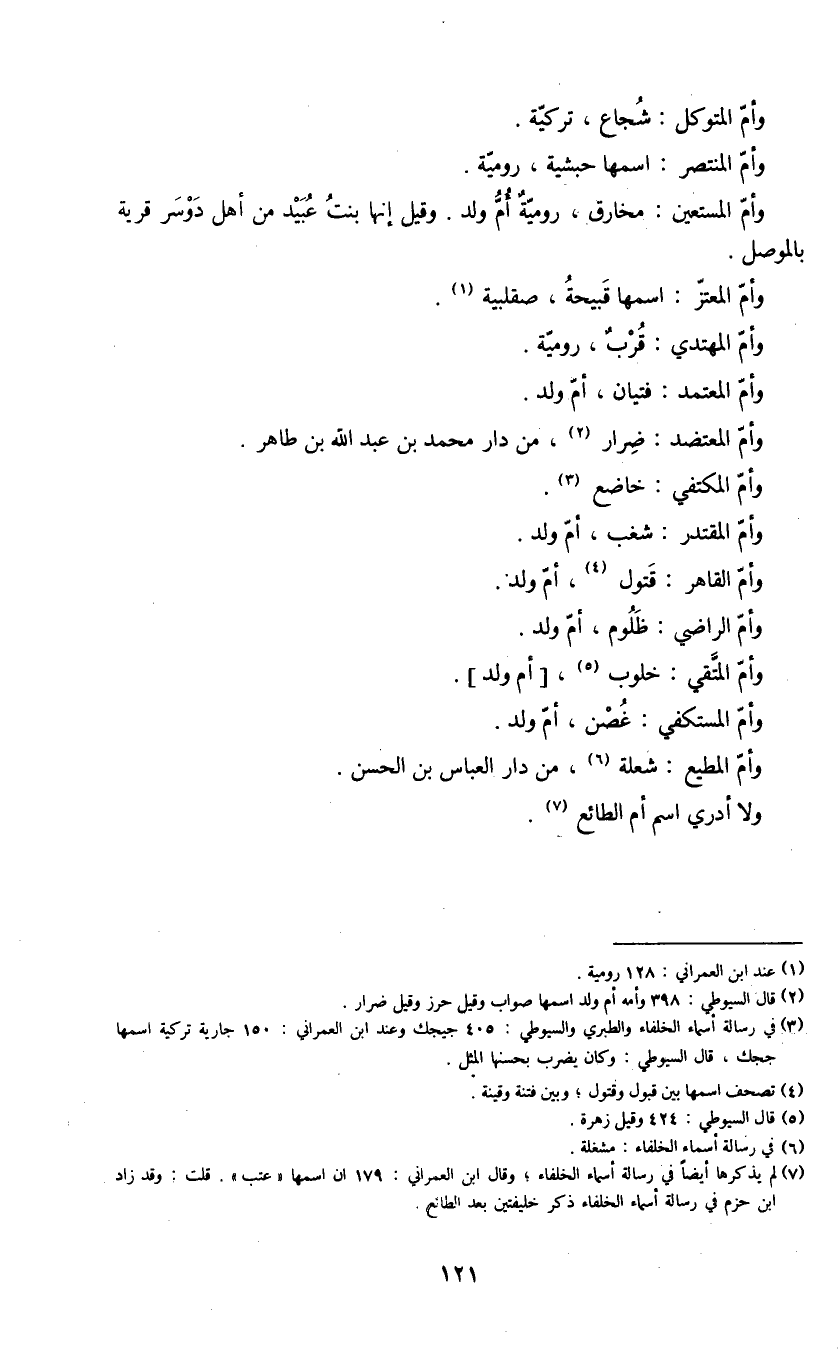 (3) في رسالة أسماء الخلفاء والطبري والسيوطي: 405 جيجك وعند ابن العمراني: 150 جارية تركية اسمها ججك، قال السيوطي: وكان يضرب بحسنها المثل.